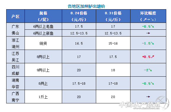 | 中國水產(chǎn)頻道原創(chuàng)報道, 文/圖 何氏水產(chǎn)、水產(chǎn)前沿 李靜 加州鱸 1、本周加州鱸老魚6兩以上塘頭正價17元/斤,一般走車都是16.5元/斤,比上周跌了0.5元/斤。新魚塘頭價格比較亂,12-14元/斤的都有,主要看魚頭定價。近期開塘新魚較多,老魚相對少一些。據(jù)了解廣東產(chǎn)區(qū)魚病害還是比較嚴重,存塘或多或少存在花身、爛身的情況,流通商會視塘魚病魚的情況壓價。預(yù)計接下來價格或?qū)⑦會有小幅下滑。 2、湖州本周統(tǒng)貨報價15-16元/斤,比上周下跌1.5元/斤。具體價格要看魚頭大小和規(guī)格成數(shù)而定,本地出魚量也不多,主要是本地銷售為主。 3、江蘇吳江本周價格與上周上漲了0.5元/斤,8兩上報價17.5元/斤,9兩上報價18元/斤。價格會根據(jù)魚頭大小及規(guī)格比例多少略有調(diào)整。當?shù)仞B(yǎng)戶出魚積極性較高,銷量跟上周差不多。 4、四川成都今天報價9兩上18元/斤,比上周下跌了2元/斤。市場起不了量,價格也隨之下滑。后市價格或?qū)⒊掷m(xù)下行。 5、湖南華容本周價格比上周下跌了0.5元/斤,8兩上報價是17-18元/斤。當?shù)乩萧~存塘量減少,新魚尚未達到上市規(guī)格,預(yù)計下個月底上市。廣西南寧本周價格保持穩(wěn)定,報價20元/斤,銷量跟上周也差不多。 |