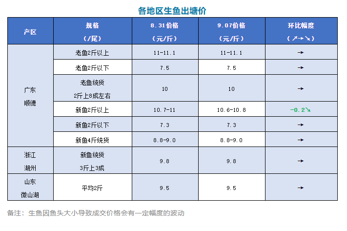 | 中國水產頻道原創報道, 文/圖 何氏水產、水產前沿 李靜 生魚 1、本周廣東生魚塘頭價格基本穩定,大魚微跌。塘頭報價老魚2斤以上11-11.1元/斤,跟上周一樣;2斤以下報價7.5元/斤;老魚統貨2斤上8成左右報價10元/斤,保持穩定;新魚4斤統貨8.8-9.0元/斤;2斤上報價10.6-10.8元/斤,比上周下跌了0.2元/斤;2斤以下報價7.3元/斤,跟上周一樣。每塘魚的最終成交價格都是根據魚頭大小以及2斤以上成數來決定的。高溫天氣持續,塘頭抓魚放網情況比較多,硬骨、白身的情況也時有發生,導致市場供應有所緊張,但緊張程度還不足以讓流通商提價收魚。預測短期內魚價還將保持穩定。 2、浙江湖州本周新魚統貨3斤上3成左右報價9.8,保持穩定。山東微山湖產區本周價格保持穩定,平均2斤報價9.5元/斤,銷量跟上周也差不多。 |