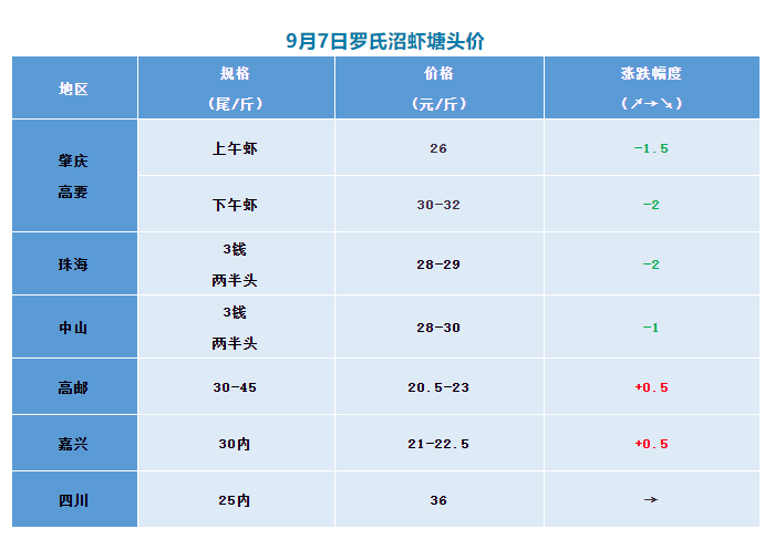 | 中國水產頻道原創報道, 文/水產前沿何鴻浩 一周要聞 1、消費乏力,蝦價下跌明顯 近半個月,多地斑節對蝦、羅氏沼蝦價格持續下跌。從業者多表示,價格下滑原因還是因為消費市場,消費者消費能力降級,對高價水產品消費能力弱。反觀南美白對蝦方面,雖然接連漲價,但漲價幅度并不大,相比其他品種更具性價比,仍在消費者接受范圍內。 2、廣東羅氏沼蝦持續下滑 本周市場趨勢仍與上周相似,珠三角地區羅蝦價格下滑,江浙地區羅蝦價格小幅上漲。珠三角從業者表示,近來消費降級似乎成定局,每日流通量不大但市場銷售也很困難。另外,因近期市場需求弱,流通商對蝦品質更為看重,看蝦定價且價格差異較大。 3、斑節對蝦同樣下跌明顯 自上周斑節蝦出現回落趨勢后,本周各地斑節對蝦下滑情況更為明顯,幅度約在2-3元/斤。但同時,大規格斑節蝦因存量少且抗波動能力強,價格仍然比較穩定。部分養殖戶認為,現在的蝦價并不匹配斑節蝦的市場定位、成本投入和養殖風險,希望國慶價格能有所回升,讓大家重拾信心。 |