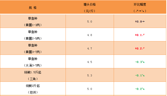 文/ 水產(chǎn)前沿 何鴻浩 中國水產(chǎn)頻道原創(chuàng)報道,草魚種:本周草魚種開始有所反彈,價格微升。現(xiàn)階段足規(guī)格新魚存塘較多,大量供應(yīng)市場,隨著超市統(tǒng)鯇價格回落,預(yù)計價格不會有大幅度變化。 統(tǒng)鯇:價格持續(xù)下跌,較上周整體下跌0.1-0.2元/斤;1.5斤規(guī)格下跌0.1元/斤,價格為5.3元/斤;2斤上價格下跌0.1-0.2元/斤,價格在5.0-5.2元/斤;3斤上規(guī)格下跌0.2元/斤,價格為5.0元/斤。 大草魚:價格保持穩(wěn)定,較上周維持不變,4斤上6.3元/斤;5斤上6.8元/斤。 脆肉鯇:本周脆肉鯇價格穩(wěn)定,目前市場庫存舊魚極少,日需求穩(wěn)定。近期天氣轉(zhuǎn)涼較快,脆肉鯇市場需求會增大,供求暫時平衡,短期價格走勢預(yù)計穩(wěn)定。 |