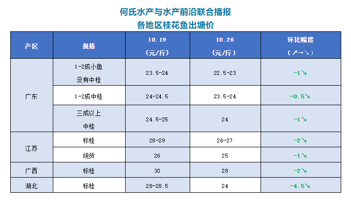 | 中國水產頻道原創報道, 文/圖 何氏水產、水產前沿 李靜 桂花魚 本周廣東鱖魚新魚價格持續下跌。主要原因是外省新魚集中上市,加上蟹塘也有部分推出市場且價格比廣東魚便宜,所以近期鱖魚價格下滑趨勢明顯。本周市場行情還是沒有好轉,總體銷量持續下滑;1-2成小魚沒有中桂開塘22.5-23元/斤,比上周下跌了1.0元/斤;1-2成中桂開塘價在23.5-24元/斤,比上周也下跌了0.5元/斤;三成以上中桂新魚24元/斤,比上周下跌了1元/斤。目前外省蟹塘鱖魚陸續上市,魚頭小的也有8-9兩,最大的也有1斤6-7兩。預計11月中旬還會有大量蟹塘鱖魚集中出魚,價格還會持續下跌。 廣西產區標桂比上周價格下跌了2元/斤,價格只剩下28元/斤,當地很少魚出了;湖北產區標桂價格本周持續下跌了4.5元/斤,報價在24元/斤,當地蟹塘也開始上市了,價格暴跌;江蘇地區標桂價格比上周下跌了2元/斤,報價26-27元/斤,統貨下跌了1元/斤,價格只有25元/斤。預計接下來價格很難有上漲的機會。 |