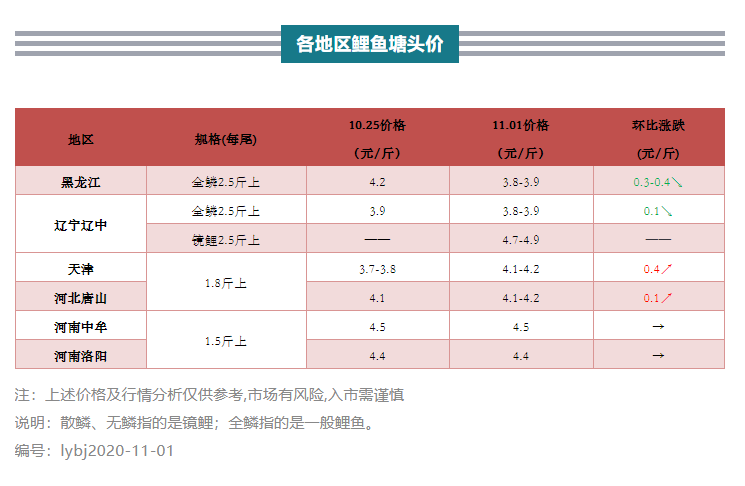 | 中國水產頻道原創報道, 黑龍江急賣全鱗鯉魚,影響輻射沖擊附近市場,遼寧首當其沖 文/水產前沿 葉豐齊 代表產區鯉魚行情走勢 整體行情綜述 本周各地鯉魚價格處于波動期;黑龍江地區部分養戶趁封冰前急賣全鱗鯉魚,走量緩慢,市場價格下行,較上周下調0.3-0.4元/斤;這波出魚影響也輻射沖擊附近市場,遼寧首當其沖,當地養戶惜售將將穩住跌勢,但魚價仍較上周下調0.1元/斤;之前受影響最大的天津地區,由于當地精養塘養戶拒絕出魚,本周市場行情回暖,較上周上調0.1-0.4元/斤。 主要養殖區行情簡析 本周各地區鯉魚行情一覽 遼寧地區:許多區域已經停料,但仍每天出魚,只是市場價格較低,養戶普遍惜售,現在出魚的都是不過冬的;預計黑龍江封冰后,到遼寧裝魚的水車將大大增加,后市魚價有機會上漲一波。本周全鱗2.5斤上3.9元/斤,同上周價格,規格偏大一些的3.8元/斤,環比上周下調0.1元/斤;2.5斤上鏡鯉則是4.7-4.9元/斤。 黑龍江地區:臨近封冰,養戶積極販售不過冬的地產魚,市場流通壓力相應增加,令魚價出現較大幅度下跌。全鱗2.5斤上規格3.8-3.9元/斤,環比上周下調0.3-0.4元/斤;出魚量較少的2.5斤上鏡鯉依然報價4.7元/斤,同上周行情。 天津和河北唐山地區:上周低價導致精養塘養戶惜售,僅大水面出魚,加上進入本地市場外省魚減少,魚中選擇空間縮小,市場行情稍稍回暖。天津1.8斤上規格鯉魚價格4.1-4.2元/斤,環比上周上調0.4元/斤;河北唐山同規格鯉魚也是4.1-4.2元/斤,環比上周上調0.1元/斤。有業者表示,目前部分池塘已經停料,等待年底開春魚價好轉,再出統貨。 河南地區:養戶看市場行情賣魚,時刻做好停料過冬準備,本周出魚量不多,價格較為平穩。中牟和洛陽1.5斤上規格鯉魚報價4.5元/斤,基本和上周行情一致。 |