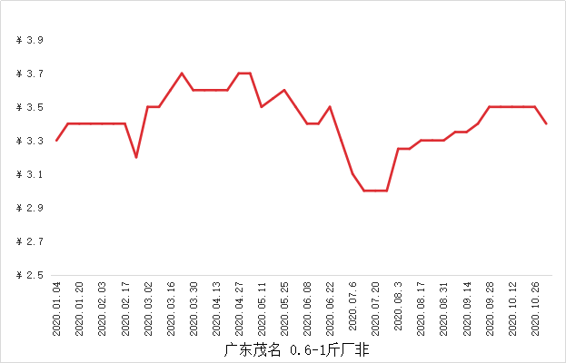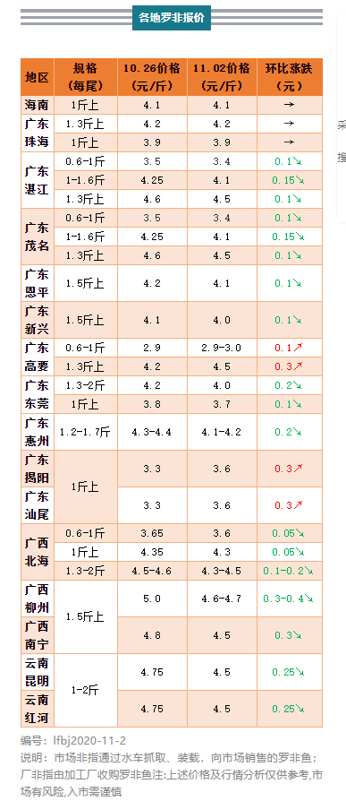| 中國水產頻道原創報道, 規格超大,入廠不成,轉而集中出市場,多地羅非行情下調 文/水產前沿葉豐齊 水產前沿專業為你推送羅非魚 最新價格行情及行業新聞、各類資訊。 同時歡迎行業人士踴躍爆料,請掃二維碼聯系 代表產區羅非魚行情走勢 整體行情綜述 本周多產區羅非魚行情下行,局部區域稍微回暖,少數保持平穩。海南地區各規格羅非價格與上周持平;珠三角地區,珠海各規格羅非行情不變,恩平地區各規格羅非行情皆下調0.1元/斤;新興市場非價格下調0.1元/斤;東莞1.2-2斤上規格羅非價格下調0.2元/斤,1斤上廠非下調0.1元/斤;肇慶高要0.6-1斤規格廠非上調0.1元/斤,1.3斤上規格上調0.3元/斤;粵東地區惠州市場非下調0.2元/斤;揭陽和汕尾廠非行情上調0.3元/斤,市場非維持不變;粵西地區湛江和茂名0.6-1斤規格廠非較上周下調0.1-0.3元/斤,1斤上廠非價格下調0.15元/斤,市場非下調0.1元/斤;廣西南寧市場非價格較上周下調0.3元/斤,柳州下調0.3-0.4元/斤,北海市場非下調0.1-0.3元/斤,各規格廠非皆下調0.05元/斤;云南地區昆明和紅河1-2斤規格大非價格下調0.25元/斤,6兩-1斤規格羅非維持上周價格不變。 各產地行情分析 海南地區:供求基本達到較為平衡狀態,工廠和市場行情都相對穩定。0.6-1斤規格廠非收購價3.1元/斤,塘頭現金收購價2.9元/斤,皆同上周價格;1斤上規格廠非4.1元/斤,塘頭現金收購價3.9元/斤,同上周。 珠三角地區:除了珠海沒有多少魚外,其他區域仍有一些超規格魚,入不了工廠,只好集中出市場,導致市場非較為難市;另外,由于廠非出魚不少,局部地區價格有所下調,而肇慶高要則由于今年養較少羅非,當地市場行情穩定,本周增加收購量,令魚價上行。珠海1.3斤上規格市場非4.2元/斤,0.6-1斤規格廠非2.9元/斤,1斤上規格3.9元/斤,4斤上大羅非塘頭價8.3元/斤,皆維持上周價格。東莞1.2-2斤以上規格羅非出市場車塘頭價4元/斤,環比上周下調0.2元/斤;0.6-1斤規格2.7元/斤,1斤上3.7元/斤,環比上周下調0.1元/斤。恩平1.8-2斤規格市場非4.1元/斤,6兩上廠非3元/斤,1斤上規格4元/斤,環比上周皆下調0.1元/斤。新興1.5斤上規格市場非到手價4元/斤,環比上周下調0.1元/斤;肇慶高要0.6-1斤規格廠非塘頭價2.9-3元/斤,環比上周上調0.1元/斤,1斤上廠非3.7-3.8元/斤;1.3斤上市場非4.5元/斤,環比上周上調0.3元/斤。 粵東地區:惠州主要由本地車裝魚,因為市場不好賣,每次一般裝1000多斤,2000斤以上的沒有幾輛;目前養戶積極售賣規格足夠大的魚,希望趕在天冷前清掉好降低風險,魚價因此受到影響;1.2-2斤規格走本地市場羅非上午車4.1元/斤,下午車4.2元/斤,環比上周皆下調0.2元/斤。揭陽和汕尾方面,本地和福建凍廠訂單需求有所增加,收購價略為上調,入廠魚多,市場魚價也較為穩定;1斤以上規格廠非(走汕尾本地凍廠)塘頭價3.6元/斤,環比上周上調0.3元/斤;1-1.2斤上規格市場非4元/斤,保持上周價格。 粵西地區:當地存塘魚不算很多,上周也有一定價格,但養戶出魚積極性不是特別高。本周部分魚車轉往外圍市場拉魚回湛江、茂名,對本區域市場影響頗大;無論入廠還是走市場,如今本地魚走量緩慢,或有一些養戶恐慌出魚,行情因而下調。1.3-1.7斤上規格市場非4.5元/斤,環比上周下調0.1元/斤。加工廠方面,0.6-1斤規格廠非3-3.2元/斤,5成加成至3.2-3.4元/斤,環比上周皆下調0.1-0.3元/斤;1斤上規格4.1元/斤,環比上周下調0.15元/斤。 廣西地區:市場車基本在防城、南寧、柳州等地拉魚,到防城的車相對少,1.5斤上規格報價4.3-4.4元/斤;同規格南寧4.5元/斤,環比上周下調0.3元/斤;柳州4.6-4.7元/斤,環比上周下調0.3-0.4元/斤。因為差價不理想,所以到北海拉魚的市場車甚少,魚價下行,1.3-2.3斤規格市場非4.3元/斤,散賣4.5元/斤,環比上周下調0.1-0.3元/斤。不得已,養戶只能選擇賣加工廠,由于出魚量相對大,對收購價亦稍有影響;北海0.6-1斤規格廠非到廠價3.3元/斤,加成后最高3.6元/斤,1斤上規格廠非到廠價4.3元/斤,環比上周皆下調0.05元/斤。 |