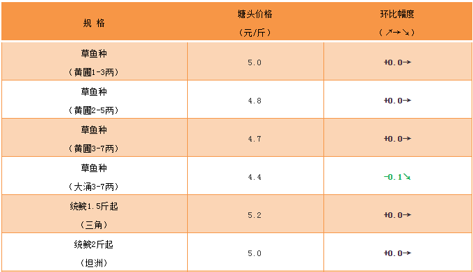 大草魚:價格維持穩定,4斤上6.6元/斤;5斤上7.1元/斤。