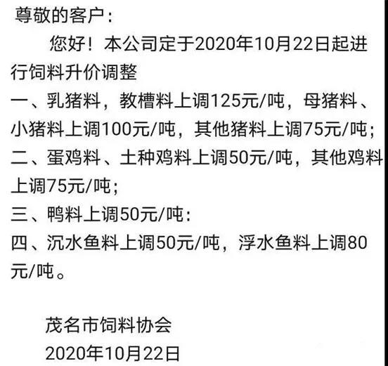 來源:水產前沿、證券日報、飼料行業信息網、糧油信息網 中國水產頻道報道,隨著原料價格持續走高,飼料廠成本增加,壓力越來越大,10-11月以來,飼料市場的漲價潮一直停不下來。 江門、佛山、茂名、海南水產料全面漲價? 水產料方面,繼茂名市飼料協會、海南省飼料獸藥行業協會日前發布漲價通知后,近日,又有兩個飼料商會發布漲價通知,一個為江門市飼料商會,一個為佛山市順德區飼料商會。 江門市飼料商會在11月11日的調價通知中稱,由于近期部分飼料原料價格持續上漲,為確保產品質量,適應市場經濟規律,保障行業健康發展,商會建議各企業于2020年11月12日起對部分飼料成品價格作出如下調整:普通水產膨化料漲價4元/包;沉水魚料漲價4元/包。 佛山市順德區飼料商會在11月11日的調價通知中稱,由于近期部分飼料原材料價格持續上漲,為保證飼料產品質量,適應市場經濟規律,保障行業健康發展,經與周邊的部分大型飼料企業及理事協商,商會建議各企業于2020年11月12日起,對飼料成品價格作出調整,請各企業根據自己的實際情況進行相應調價,調價幅度如下:普通水產膨化料漲價4元/包;沉水魚料漲價4元/包。 江門市飼料商會調價通知 佛山市順德區飼料商會調價通知 海南省飼料獸藥行業協會上調飼料價格通知 茂名市飼料協會上調飼料漲價通知 正大三寶飼料漲價通知 面對飼料原料頻頻漲價,各大飼料商會不斷發出漲價通知,那么,2020年結束之前,水產料會大漲價嗎? 缺貨缺貨!最高漲至5345元/噸,豆價屢次創新高 我國的“18億畝耕地紅線”最重要的目的是要保證三大主糧的產量(小麥、水稻、玉米),留給大豆的空間就相對有限。所以我們缺大豆已經不是一天兩天的事情,但是最近這種“一豆難求”的局面仍然很少見。 供給嚴重不足需求又穩定增加,導致近期大豆價格已經改變了歷史。 11月9日,代表國產大豆行情的豆一期貨價格最高已經到5299元/噸,創該品種2002年上市以來新高。 11月12日截止發稿,豆一期貨主力合約最高漲至5345元/噸,再次創下新高。 根據海關總署最新統計的數據顯示,2020年10月份我國大豆進口量為868.8萬噸,同比增加41%;今年1-10月大豆累計進口量為8321.7萬噸,同期漲幅達到17.7%。 豆粕、玉米、菜粕持續聯動上漲 受玉米、大豆、豆粕、菜粕等主要原料價格上漲因素影響,“雙11”國內飼料加工企業漲價忙,新希望、正大、通威、正邦、贛達禽業等飼料加工企業紛紛向下游客戶和經銷商發去調價函,計劃上調生豬、禽類飼料終端價格每噸50元至100元不等。 東方財富CHOICE金融數據終端顯示,今年6月以來,作為飼料主要原料之一的豆粕期貨價格漲幅明顯,從6月中旬平均每噸2700元上漲至10月末平均每噸3280元,累計漲幅達到21.48%。 原料價格上漲飼料加工商提價傳導壓力 東方財富CHOICE金融數據終端顯示,今年6月以來,作為飼料主要原料之一的豆粕期貨價格漲幅明顯,從6月中旬平均每噸2700元上漲至10月末平均每噸3280元,累計漲幅達到21.48%。 國內豆粕主力合約一路走高(供圖:東方財富) 東方財富CHOICE金融數據終端顯示,豆粕價格上漲并非個例,同為飼料主要原料之一的玉米期貨價格漲幅也較為明顯,從6月中旬平均每噸2000元上漲至10月末平均每噸2600元,累計漲幅達到30.00%。 國內玉米主力合約一路走高(供圖:東方財富) 此外,大豆、豆油、菜粕、菜油等相關品種的主力合約價格也有不同程度的上漲。 11月11日凌晨,美國農業部發布11月份谷物供求報告。報告將美國大豆單產從10月份預估每英畝51.9蒲式耳下調至每英畝50.7蒲式耳,將預計產量從42.68億蒲式耳下調至41.70億蒲式耳,將預計結轉庫存從2.9億蒲式耳下調至1.9億蒲式耳,將阿根廷大豆預計產量調減250萬噸為5100萬噸,預計中國大豆進口維持1億噸水平不變。該報告公布后,美國芝加哥商品期貨交易所掛牌的大豆期貨價格迅速拉升3.27%,創出近4年價格新高。 中信期貨分析師陳靜向《證券日報》記者表示:“本輪飼料原料價格上漲的原因是多方面的。首先,國內養殖企業積極補充生豬產能,飼料需求看高一線。其次,新冠疫情影響世界主要農作物產區,南美大豆產區未來難言樂觀。再次,拉尼娜現象日趨加劇,干旱及山火影響美國大豆收獲量,結轉庫存亦不及市場預計。在以上因素驅動下,以大豆上漲為首,市場推動豆粕、玉米、菜粕等飼料原料價格聯動上漲。” 半月內飼料已3輪大漲價 如果說上面所述,江門市飼料商會和佛山市順德區飼料商會建議11月12日飼料漲價為第3輪漲價,那么之前就有2輪漲價。在一個月多時間內,各大飼料廠漲價一直上演,持續時間之久,涉及企業之多,范圍之廣,影響之大,可謂是近年來飼料業罕見。 11月第一輪漲價匯總表: 11月第二輪漲價匯總表: |