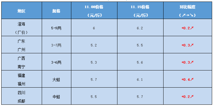 文/ 水產前沿 陳曉慶 牛蛙行情 中國水產頻道原創報道,今日牛蛙報價(廠價):5-9兩報價6.2元/斤,4-8兩報價6.1/斤,3-7兩:6元/斤。以上價格僅供參考,不同地區價格有所差異。 本周牛蛙價格略有上漲,主要是小蛙漲幅較大,相比上周上漲了0.4元/斤,中大蛙相比上周只上漲了0.2元/斤,目前各地小蛙存塘量開始減少,價格上升空間較大,大蛙價格預計會保持穩定,大蛙小蛙的價格差距逐漸拉小。 現金價格方面,廣東廣州3-7兩蛙現金報價5.5元/斤,4-7兩蛙報價5.6元/斤,福建福州大蛙6.1元/斤,四川成都小蛙5.5元/斤中蛙5.7元/斤,各地現金價格都上調了0.3-0.4元/斤。 牛蛙苗方面,本周價格已經有所下跌,目前在2.5-3分/尾。 牛蛙價格(現金價) 備注:價格隨區域以及規格大小有所差異,僅供參考,具體價格請以當地牛蛙收購商為準。 黑斑蛙行情 上周黑斑蛙價格觸底反彈,上調1-1.5元/斤,本周黑斑蛙價格持穩。近期冷空氣依然比較“弱勢”,全國各地溫度還是偏高,蛙價上漲預計還得再等等。 黑斑蛙價格 |