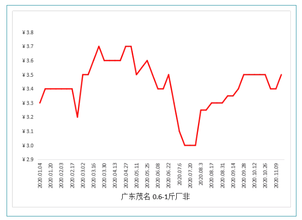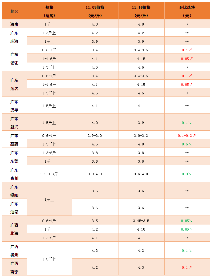 文/ 水產前沿 葉豐齊 代表產區(qū)羅非魚行情走勢 整體行情綜述 中國水產頻道原創(chuàng)報道,本周各產區(qū)羅非魚行情基本平穩(wěn),局部市場非價格下調,個別地區(qū)廠價有上調跡象。海南地區(qū)羅非供求比較平衡,各規(guī)格羅非價格平穩(wěn);珠三角地區(qū),珠海存魚與市場需求皆不高,羅非價格持平;新興市場非難市,較上周下調0.1元/斤;肇慶高要市場非不走量,下調0.5元/斤,廠非較缺皆上調0.1-0.2元/斤;恩平存塘量不多,出魚意愿偏低,各規(guī)格羅非行情保持穩(wěn)定;東莞1.2-2斤上規(guī)格市場非賣不動,多數養(yǎng)戶出6兩上及1斤上廠非,價格暫時穩(wěn)定;粵東地區(qū)惠州市場非流通緩慢,價格下調0.3元/斤;揭陽和汕尾存塘魚不多,近期凍廠收購量穩(wěn)定,市場非較少,價格皆保持不變;粵西地區(qū)湛江和茂名市場非基本走不動,價格暫時維持,而廠非價格皆上調0.05-0.1元/斤;廣西方面,北海市場非如今少有人賣,價格不變,因為入廠居多,0.6-1斤以及1斤上規(guī)格廠非皆下調0.05元/斤;而南寧市場非因北海來魚減少而上調0.1元/斤,柳州則由于本地銷量不高,下調0.1元/斤。 各產地行情分析 海南地區(qū):0.6-1斤規(guī)格廠非收購價3元/斤,塘頭現金收購價2.8元/斤,皆同上周價格;1斤上規(guī)格廠非4元/斤,塘頭現金收購價3.8元/斤,皆同上周行情。 珠三角地區(qū):珠海1.3斤上規(guī)格市場非4.2元/斤,0.6-1斤規(guī)格廠非2.9元/斤,1斤上規(guī)格3.9元/斤,皆維持上周價格。東莞1.2-2斤以上規(guī)格羅非出市場車塘頭價3.8元/斤,0.6-1斤規(guī)格2.8元/斤,1斤上3.8元/斤,皆同上周。恩平1.8-2斤規(guī)格市場非4.1元/斤,1斤上規(guī)格4元/斤,皆同上周價格。新興1.5斤上規(guī)格市場非到手價3.9元/斤,環(huán)比上周下調0.1元/斤;肇慶高要0.6-1斤規(guī)格廠非塘頭價3.0-3.2元/斤,環(huán)比上周上調0.1-0.2元/斤;1斤上廠非3.8-4元/斤,環(huán)比上周上調0.1-0.2元/斤;1.3斤上市場非4元/斤,環(huán)比上周下調0.5元/斤。 粵東地區(qū):1.2-2斤規(guī)格走本地市場羅非上午車3.6元/斤,環(huán)比上周下調0.3元/斤,下午車4元/斤,同上周價格。揭陽和汕尾方面,1斤以上規(guī)格廠非(走汕尾本地凍廠)塘頭價3.6元/斤,1-1.2斤上規(guī)格市場非4元/斤,皆保持上周行情。 粵西地區(qū):1.3-1.7斤上規(guī)格市場非4.5元/斤,同上周。加工廠方面,0.6-1斤規(guī)格廠非3.15元/斤,環(huán)比上周下調0.05元/斤,5成加成至3.4-3.5元/斤,上調0.1元/斤;1斤上規(guī)格4.15元/斤,環(huán)比上周上調0.05元/斤。 廣西地區(qū):1.5斤上規(guī)格防城4.2元/斤;同規(guī)格南寧4.3元/斤,環(huán)比上周上調0.1元/斤;柳州4.2元/斤,環(huán)比上周下調0.1元/斤。北海1.3-2.3斤規(guī)格市場非4.1元/斤,同上周;0.6-1斤規(guī)格廠非到廠價3.15-3.2元/斤,加成后最高3.45-3.5元/斤,1斤上規(guī)格廠非到廠價4.15元/斤,環(huán)比上周皆下調0.05元/斤,個別收購價亦有4.25元/斤。 各地羅非報價 編號:lfbj2020-11-16 說明:市場非指通過水車抓取、裝載,向市場銷售的羅非魚;廠非指由加工廠收購羅非魚注:上述價格及行情分析僅供參考,市場有風險,入市需謹慎 |