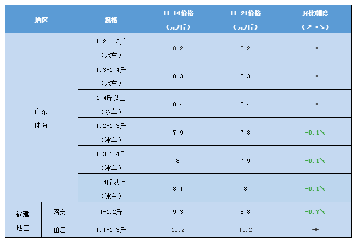 文/ 水產(chǎn)前沿 陳曉慶 感謝進才水產(chǎn)供圖 一周行情分析 中國水產(chǎn)頻道原創(chuàng)報道,珠海海鱸:本周珠海海鱸價格相比上周變化不大,冰車下跌0.1元/斤,水車價格持平。1.4斤以上規(guī)格,冰車8.0元/斤,水車8.4元/斤;1.3-1.4斤規(guī)格,冰車7.9元/斤,水車8.3元/斤;1.2-1.3斤規(guī)格,冰車7.8元/斤,水車8.2元/斤。 目前,珠海海鱸頭批魚規(guī)格大多在1.4斤左右,中批魚只有7-8兩左右,未達上市規(guī)格,而尾批魚需等明年4-8月才能上市。為了資金回籠,以便在年前順利結(jié)算飼料等欠款,多數(shù)養(yǎng)殖戶都選擇在11月中旬之前賣魚,這也是造成目前魚價低迷的原因之一。 今年病害較多,由于動保和塘租成本的增加,目前的價格對于養(yǎng)殖戶來說只能勉強保本甚至虧本。目前福建地區(qū)已經(jīng)開始有魚苗供應(yīng),面對新一輪的投苗季,今年的投苗熱情普遍不如去年,塘租也有所有所下跌。 福建海鱸:本周詔安海鱸下跌0.7元/斤,涵江海鱸價格穩(wěn)定。目前詔安海鱸價格在8.8元/斤左右,清池底的報價8.5元/斤。目前詔安有些塘口開始清塘進行新一輪的投苗,出魚量增多,價格也應(yīng)聲下跌。 價格走勢 11月21日塘頭報價 說明:上述價格及行情分析僅供參考,市場有風(fēng)險,入市需謹(jǐn)慎 編號:hlbj2020-11-21 |