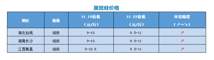 | 中國水產頻道原創報道, 本周牛蛙價格穩中有跌,黑斑蛙價格緩慢回漲 文/水產前沿陳曉慶 牛蛙行情 今日牛蛙報價(廠價):5-9兩報價6.2元/斤,4-8兩報價6.1/斤,3-7兩:6元/斤。以上價格僅供參考,不同地區價格有所差異。 本周牛蛙廠價和上周持平,現金價格方面也比較穩定,但廣東、廣西、福建等地也有0.1元左右的跌價。 廣東澄海目前已經有蛙上市,但大蛙還是極少,以中蛙為主,大量出蛙主要還是集中在廣西和廣東澄海的外圍市場。今年的蛙留到明年再出成本又會再增加1-2元,由于后市行情的不確定性,今年冬天太冷的話風險又將增加,再加上目前的蛙價低迷,養殖戶在猶豫要不要留蛙過冬。 黑斑蛙行情 受冷空氣影響,本周國內多地出現大幅度降溫。在南方江淮、江漢、江南以及西南地區東部等地,最高氣溫的低點將出現在明天,合肥、武漢、長沙等地的最高氣溫甚至會降至個位數,比常年同期氣溫要偏低6至7℃。 |