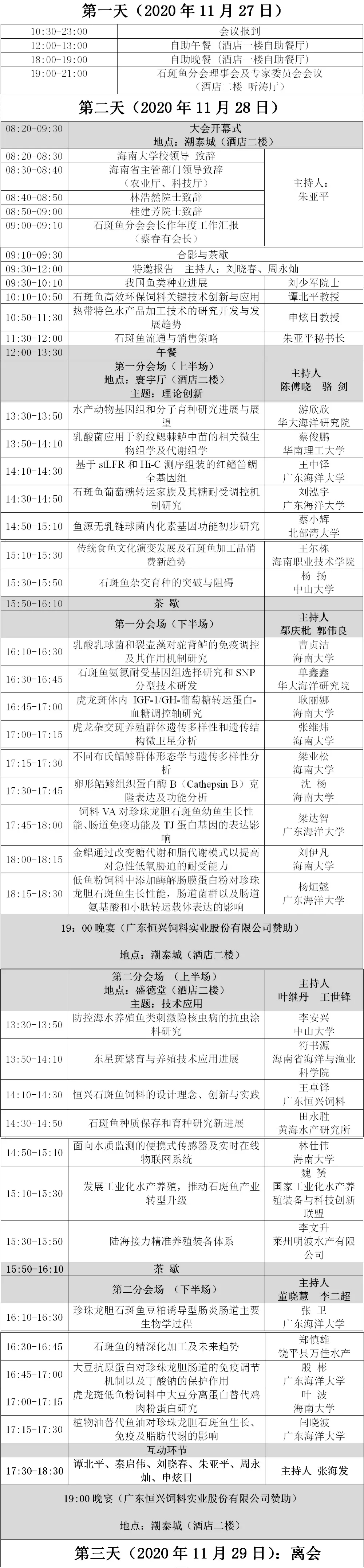 | 中國水產(chǎn)頻道報道, 11月27日-29日,相約海南·海口! 第十一屆全國石斑魚產(chǎn)業(yè)發(fā)展論壇 暨中國水產(chǎn)流通與加工協(xié)會石斑魚分會2020年會 2020年11月27日-29日海南·海口 議程重磅發(fā)布 ▽▽▽ 尊敬的學術界、企業(yè)界同仁: 您好! 由中國水產(chǎn)流通與加工協(xié)會石斑魚分會主辦,海南大學承辦的第十一屆全國石斑魚產(chǎn)業(yè)發(fā)展論壇暨中國水產(chǎn)流通與加工協(xié)會石斑魚分會2020年會(以下簡稱論壇),在各科研院所、知名企業(yè)的鼎力支持下,將于2020年11月27-29日在海南省海口市鵬輝泰德大酒店舉行。 石斑魚產(chǎn)量已超20萬噸,成為我國海水養(yǎng)殖魚類的第二大品種。新冠疫情的爆發(fā)卻對石斑魚產(chǎn)業(yè)產(chǎn)生了嚴重的負面影響,石斑魚產(chǎn)業(yè)亟需加速結(jié)構(gòu)性調(diào)整和轉(zhuǎn)型升級。本次論壇將以“新品種、新技術、新機遇”為主題,圍繞石斑魚新品種研究、養(yǎng)殖新技術及模式、銷售新趨勢、精深加工、產(chǎn)業(yè)現(xiàn)狀及未來發(fā)展等方面進行交流與研討。論壇邀請了林浩然院士、桂建芳院士、劉少軍院士等權(quán)威專家分享最新研究成果,還有自于19所科研院校的學者和20余家龍頭企業(yè)的精英進行論壇報告,分析行業(yè)最新變化,探索產(chǎn)業(yè)發(fā)展新路徑,共同推動石斑魚產(chǎn)業(yè)的高質(zhì)量發(fā)展。 與會代表將在這里展示成果、交流經(jīng)驗、啟迪思想,通過全方位的交流,分享彼此的科研或生產(chǎn)成果,強化產(chǎn)學研的融合!本屆論壇組委會熱忱歡迎您的到來! 一、會議主題 新品種、新技術、新機遇 二、會議主要議題 1.石斑魚育種技術與新品種開發(fā) 2.石斑魚繁殖與苗種培育技術 3.石斑魚養(yǎng)殖新技術與新模式 4.石斑魚營養(yǎng)與飼料開發(fā) 5.石斑魚免疫與病害防控技術 6.石斑魚銷售新趨勢分析 7.石斑魚保鮮、加工與消費 8.石斑魚產(chǎn)業(yè)現(xiàn)狀及未來發(fā)展 三、會議時間和地址 時間: 2020年11月27日-29日 (27日報到,28日會議,29日離會) 地點: 鵬輝泰德大酒店 (原寰島泰德大酒店,海南省海口市 美蘭區(qū)海甸島和平大道18號) 四、會議特邀嘉賓 林浩然院士中山大學 桂建芳院士中國科學院水生生物研究所 劉少軍院士湖南師范大學 五、會議注冊與報到 1.注冊費及繳納方式 正式代表1000元/人,學生代表800元/人(需出示學生證)。由于疫情防控需要、緩解現(xiàn)場注冊壓力、提高接待效率,建議參會代表提前繳納注冊費,并請及時與會務組核實信息。組委會可能無法保證每位現(xiàn)場注冊的參會人員都能獲得會議資料和酒店房間安排。 2.匯款銀行賬戶信息 賬號名稱:海南博邦會務服務有限公司 賬號:2675-3049-2719 開戶行:中國銀行海口海甸支行 在匯款或轉(zhuǎn)帳時請在備注欄注明:“石斑魚+姓名+單位”字樣。并請及時將匯款單掃描件或照片發(fā)送至會務組注冊郵箱:shibanyu_forum 163.com。 3.溫馨提醒 由于國內(nèi)本土疫情又出現(xiàn)起伏,海南防疫部門要求相關酒店接待單位前臺對賓客行程驗證工作嚴格執(zhí)行,除正常手續(xù)外增加驗證行程及健康碼。煩請參會代表在機場出關時保留好綠碼和行程截圖,到酒店前臺只需出示截圖便可快速辦理入住手續(xù)。多謝理解和支持! 4.會議通知將由會務組在報到時發(fā)放,需要提前獲取會議通知的代表請與會務組聯(lián)系。 六、組織單位 主辦單位: 中國水產(chǎn)流通與加工協(xié)會石斑魚分會 承辦單位: 海南大學 海南博邦會務服務有限公司 協(xié)辦單位: 中山大學 國家海水魚產(chǎn)業(yè)技術體系 海南省海洋與漁業(yè)科學院 海南晨海水產(chǎn)有限公司 贊助單位: 廣東恒興飼料實業(yè)股份有限公司 海南青利水產(chǎn)繁殖有限公司 海南晨海水產(chǎn)有限公司 陵水德林誠信水產(chǎn)養(yǎng)殖有限公司 海南大順發(fā)水產(chǎn)有限公司 青島海興智能裝備有限公司 三通生物工程(濰坊)有限公司 海南永賀生物科技有限公司 廣東越群海洋生物科技股份有限公司 青島明赫漁業(yè)工程科技有限責任公司 福建天馬科技集團股份有限公司 海南衡橋科技有限公司 上海阿趣生物科技有限公司 合作媒體: 《水產(chǎn)前沿》雜志 海南省電視臺 海南日報 七、參會指南 參會須知 1.PPT拷貝:做口頭報告的嘉賓,務必請于11月27日將PPT拷貝至組委會秘書組,負責人孫俊龍老師(房間號:1513室,電話:18140090127)。 2.報到:請按照預先指定的通道報到并領取資料(酒店大堂) 3.11月28日會議需憑代表證入場。請各位代表妥善保管好代表證,遺失不補。 4.請各位代表妥善保管好餐券,并到餐券上指定餐廳就餐。 5.會議期間請關閉手機或?qū)⑹謾C調(diào)至靜音狀態(tài) 6.由于國內(nèi)本土疫情又出現(xiàn)起伏,海南防疫部門要求相關酒店接待單位前臺對賓客行程驗證工作嚴格執(zhí)行,除正常手續(xù)外增加驗證行程及健康碼。煩請參會代表在機場出關時保留好綠碼和行程截圖,到酒店前臺只需出示截圖便可快速辦理入住手續(xù)。多謝理解和支持! 會務組聯(lián)系方式 會議交通 鵬輝泰得大酒店-海口美蘭國際機場 1.公交:機場巴士4號線(美蘭機場方向)寰島泰得大酒店站上車(總耗時約1.5小時,價格20元)。 2.出租:鵬輝泰得大酒店至海口美蘭國際機場(距離約25公里,約