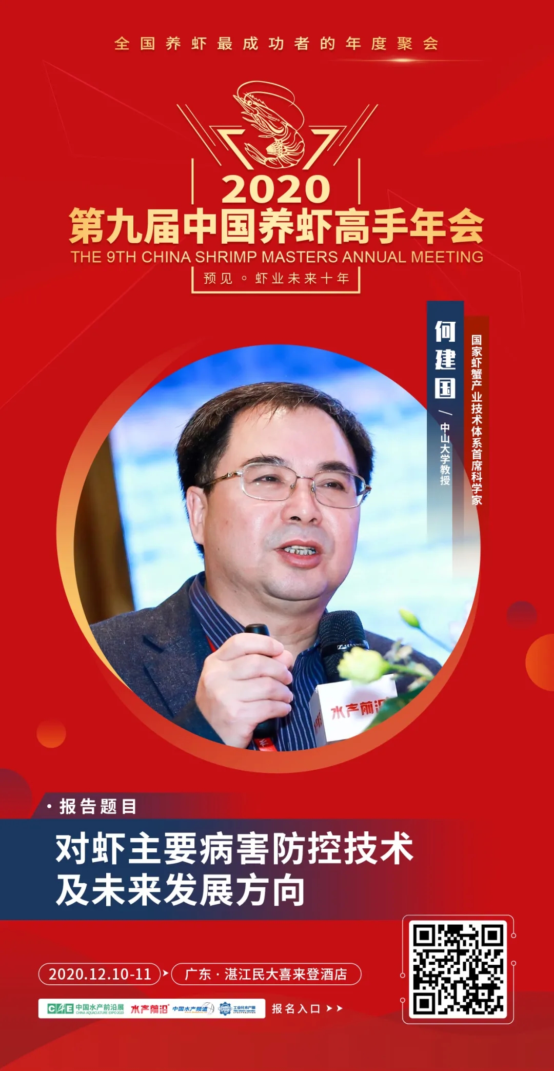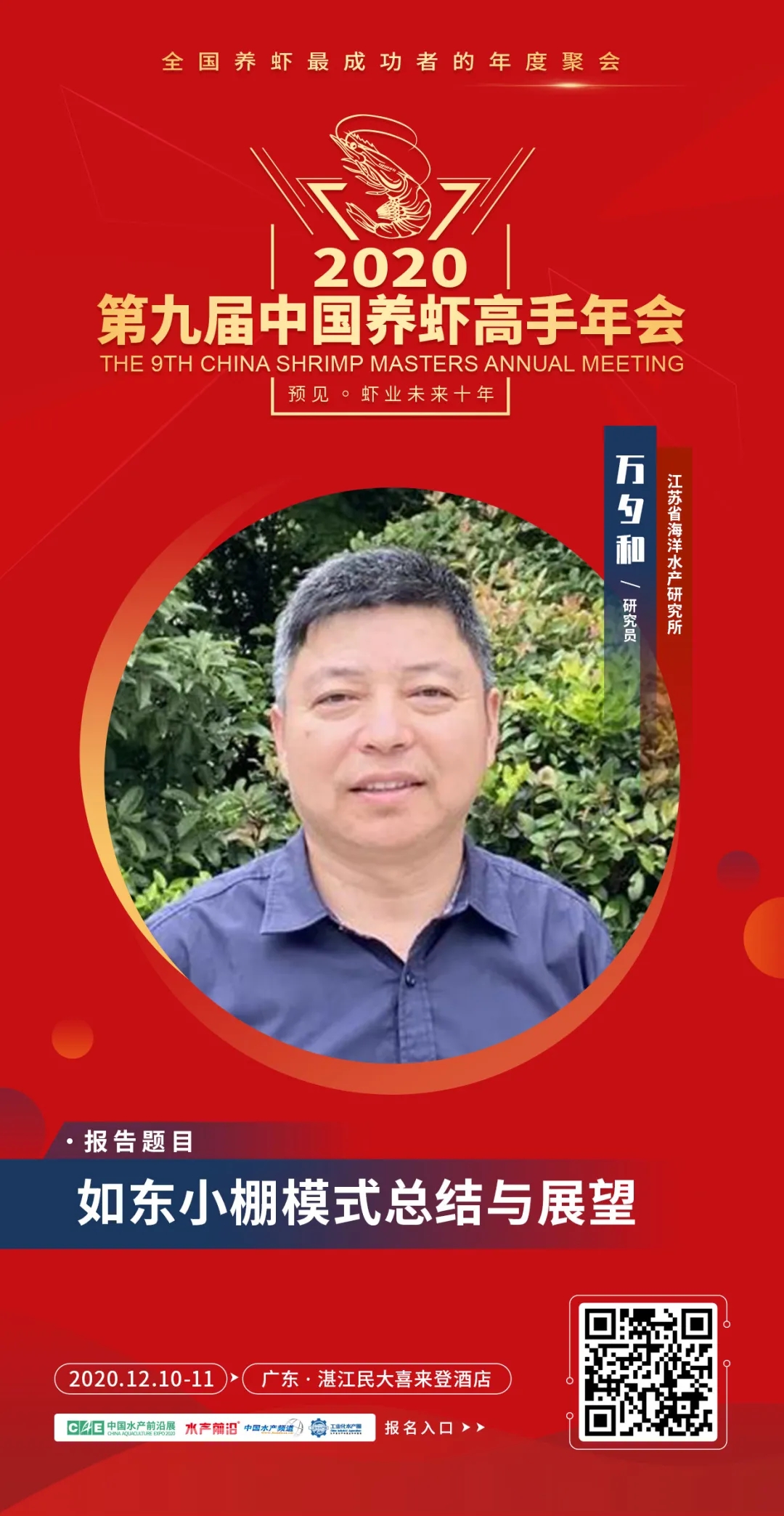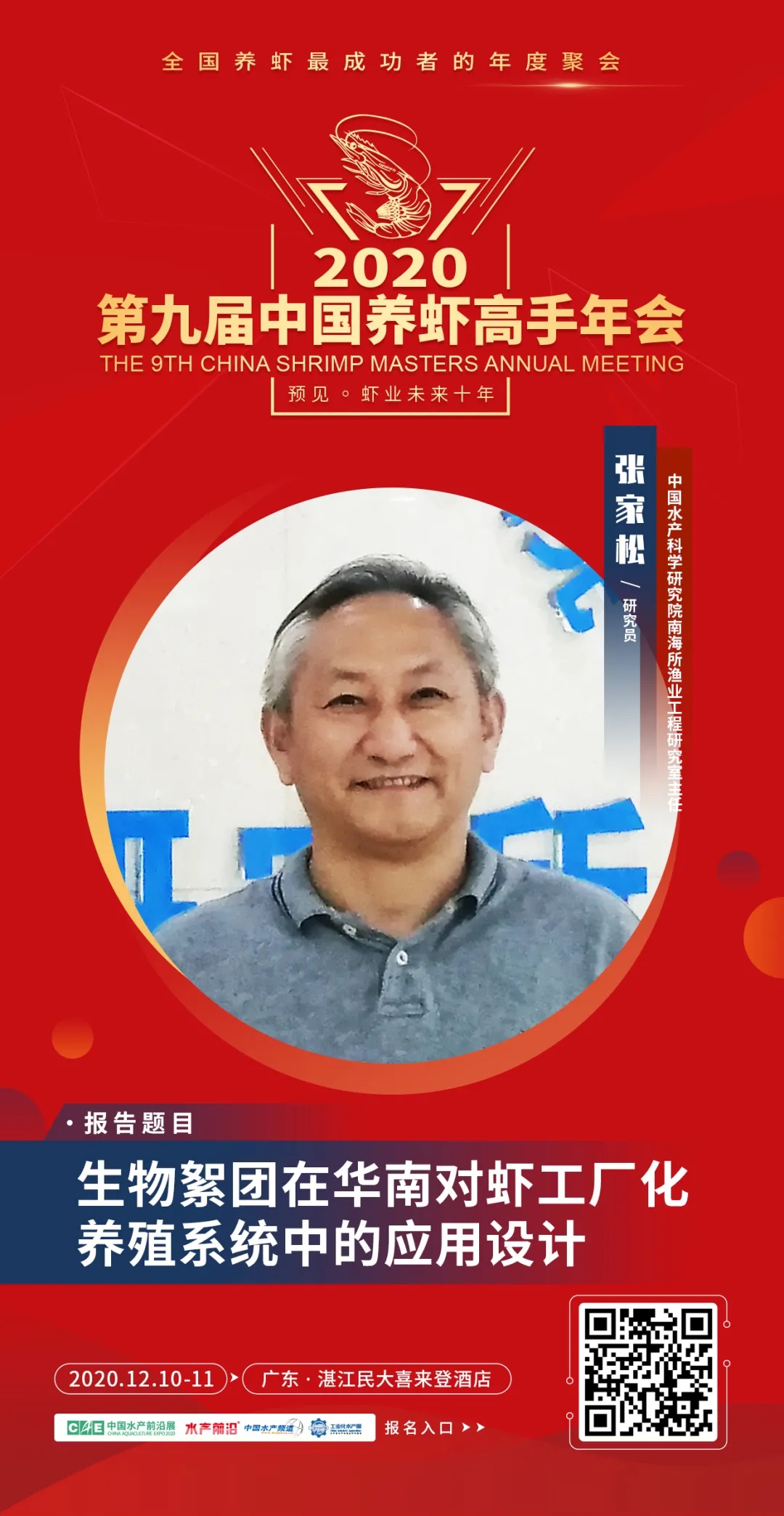 | 中國水產(chǎn)頻道報(bào)道, 15個(gè)議題報(bào)告+3場(chǎng)主題互動(dòng)論壇+60余家名優(yōu)企業(yè)展+“2020中國蝦業(yè)年度榜”頒獎(jiǎng)盛典+3場(chǎng)同期會(huì)議,12月10-11日,湛江見! 第九屆中國養(yǎng)蝦高手年會(huì) The 9th China Shrimp Masters Annual Meeting 全國養(yǎng)蝦最成功者的年度聚會(huì) 12月10-11日·湛江民大喜來登酒店 會(huì)議日程重磅發(fā)布 👇👇👇 行業(yè)翹首期待的“第九屆中國養(yǎng)蝦高手年會(huì)”定于2020年12月10-11日在廣東湛江舉行,本屆年會(huì)將以“預(yù)見蝦業(yè)未來十年”為主題,聚集蝦業(yè)各領(lǐng)域的頂級(jí)智慧,整合全球有效資源,議題將觸及對(duì)蝦業(yè)鏈條中包括種苗、飼料、動(dòng)保、設(shè)備、流通、消費(fèi)等利益相關(guān)者,主要內(nèi)容包括前沿育種育苗技術(shù)、新型養(yǎng)殖模式、飼料新配方、檢測(cè)新手段、病害防控新技術(shù)、新型養(yǎng)殖設(shè)備等關(guān)乎未來發(fā)展的問題展開。我們希望通過這種具有前瞻性的交流和自由討論,在科研、技術(shù)、產(chǎn)品、模式等多方面產(chǎn)生新想法、形成新趨勢(shì),共同展望中國蝦業(yè)未來10年,以推動(dòng)中國蝦業(yè)更健康、穩(wěn)定、持續(xù)的發(fā)展。 年會(huì)期間,還將舉行“2020中國蝦業(yè)年度榜”頒獎(jiǎng)盛典,擬推出“2020年中國蝦業(yè)二十強(qiáng)企業(yè)”、“2020年中國養(yǎng)蝦高手”、“2020年蝦業(yè)創(chuàng)新力產(chǎn)品”、“2020中國蝦業(yè)值得信賴品牌(分種苗、飼料、動(dòng)保、設(shè)備板塊)”等榜單,邀您一同見證! 年會(huì)同期舉行: 2020第二屆中國對(duì)蝦市場(chǎng)高峰論壇 第二屆中小水產(chǎn)料企技術(shù)創(chuàng)新與發(fā)展高峰論壇暨特種水產(chǎn)發(fā)展峰會(huì) 一、會(huì)議主題 預(yù)見蝦業(yè)未來十年 二、會(huì)議時(shí)間與地點(diǎn) 時(shí)間:2020年12月10-11日 地點(diǎn):廣東·湛江民大喜來登酒店 。ㄕ拷谐嗫矃^(qū)海濱大道北128號(hào)) 三、組織單位 指導(dǎo)單位: 國家蝦蟹產(chǎn)業(yè)技術(shù)體系 亞太水產(chǎn)養(yǎng)殖中心網(wǎng)絡(luò)(NACA) 主辦單位: 中國水產(chǎn)前沿展 承辦單位: 《水產(chǎn)前沿》雜志 工業(yè)化水產(chǎn)圈 協(xié)辦單位: 中海萬弘生物科技有限公司 廣東粵海飼料集團(tuán) 廣東遂溪縣好仕達(dá)實(shí)業(yè)有限公司 唐山三發(fā)普林飼料有限公司 廣東恒興飼料實(shí)業(yè)股份有限公司 上海綠奧生物科技有限公司 廈門源正龍生物科技有限公司 廣東旋達(dá)檢測(cè)技術(shù)服務(wù)有限公司 正大集團(tuán) 好潤集團(tuán) 銘治集團(tuán) 支持單位: 廣東海洋大學(xué)水產(chǎn)學(xué)院 廣東省漁業(yè)技術(shù)推廣總站 廣東水產(chǎn)學(xué)會(huì) 廣東漁業(yè)協(xié)會(huì) 中國水產(chǎn)科學(xué)研究院南海水產(chǎn)研究所 全球水產(chǎn)養(yǎng)殖聯(lián)盟(GAA) 國家工業(yè)化水產(chǎn)養(yǎng)殖與裝備科技創(chuàng)新聯(lián)盟 中國漁業(yè)協(xié)會(huì)水產(chǎn)動(dòng)保分會(huì) 海南省對(duì)蝦養(yǎng)殖協(xié)會(huì) 廣西對(duì)蝦養(yǎng)殖協(xié)會(huì) 浙江對(duì)蝦養(yǎng)殖協(xié)會(huì) 湛江市水產(chǎn)技術(shù)推廣中心站 湛江市對(duì)蝦苗種協(xié)會(huì) 如東縣南美白對(duì)蝦協(xié)會(huì) 金牌贊助單位: 青島海壬水產(chǎn)種業(yè)科技有限公司 海南海壹水產(chǎn)種苗有限公司 廣東海威水產(chǎn)養(yǎng)殖有限公司 廣東綠百多生物開發(fā)有限公司 煙臺(tái)大樂飼料有限公司 廣東海興農(nóng)集團(tuán)有限公司 海茂種業(yè)科技集團(tuán)有限公司 銀牌贊助單位: 安琪酵母股份有限公司 廈門喜大生物科技有限公司 廣州承興生物科技有限公司 上海義民電機(jī)有限公司 安迪蘇生命科學(xué)制品(上海)有限公司 臺(tái)州金湖機(jī)電有限公司 廈門君和誠生物科技有限公司 海南海聯(lián)水產(chǎn)種苗有限公司 眾合發(fā)(北京)生物科技發(fā)展有限公司 天津市漁生堂生物技術(shù)有限公司 山東寶來利來生物工程股份有限公司 廣州市利健藥業(yè)有限公司 廣州利洋水產(chǎn)科技股份有限公司 廣東海盟海洋生物科技有限公司 廣州華峰生物科技有限公司 湛江市粵凱生物科技有限公司 美國SIS(SHRIMP IMPROVEMENT SYSTEMS GROUP) 比利時(shí)英偉水產(chǎn)集團(tuán) 湛江騰飛實(shí)業(yè)有限公司 。ㄖ忻篮腺Y)四川納比生物科技有限公司 成都通威自動(dòng)化設(shè)備有限公司 海南寶萊海洋生物科技有限公司 江蘇漁樂圈生物工程有限公司 樂達(dá)(廣州)香味劑有限公司 手袋冠名: 湛江銀恒生物科技有限公司 礦泉水冠名: 海南中正水產(chǎn)科技有限公司 參會(huì)證冠名: 廣東恒興飼料實(shí)業(yè)股份有限公司 歡迎晚宴&抽獎(jiǎng)冠名: 廣東粵海飼料集團(tuán) 答謝晚宴&椅套冠名: 中海萬弘生物科技有限公司 更多贊助企業(yè)誠邀中…… 媒體支持: 中國水產(chǎn)頻道、海鮮指南、農(nóng)牧前沿、蝦蟹前沿、今日頭條、抖音、快手、網(wǎng)易新聞、養(yǎng)魚世界、農(nóng)牧世界 四、報(bào)告嘉賓與簡介 報(bào)告題目:對(duì)蝦主要病害防控技術(shù)及未來發(fā)展方向 報(bào)告嘉賓:國家蝦蟹產(chǎn)業(yè)技術(shù)體系首席科學(xué)家、中山大學(xué)何