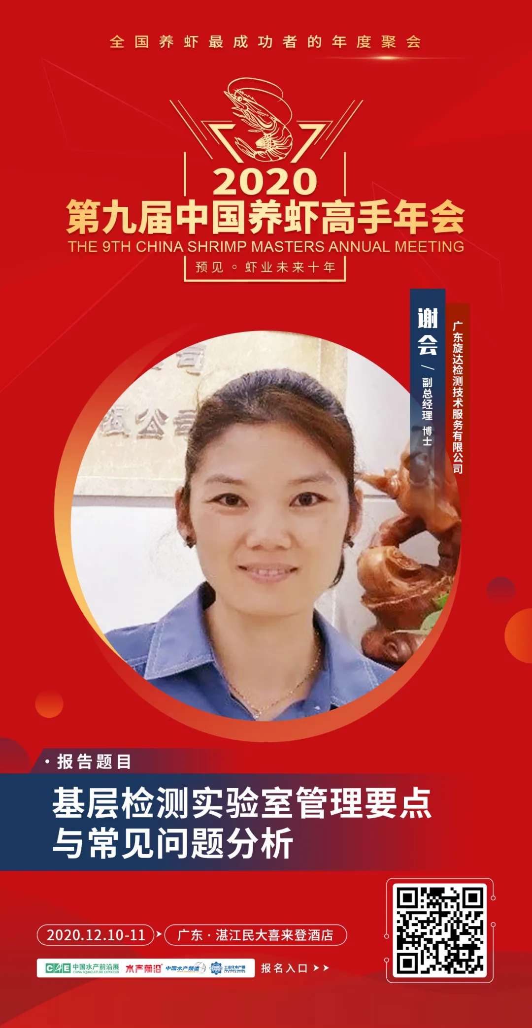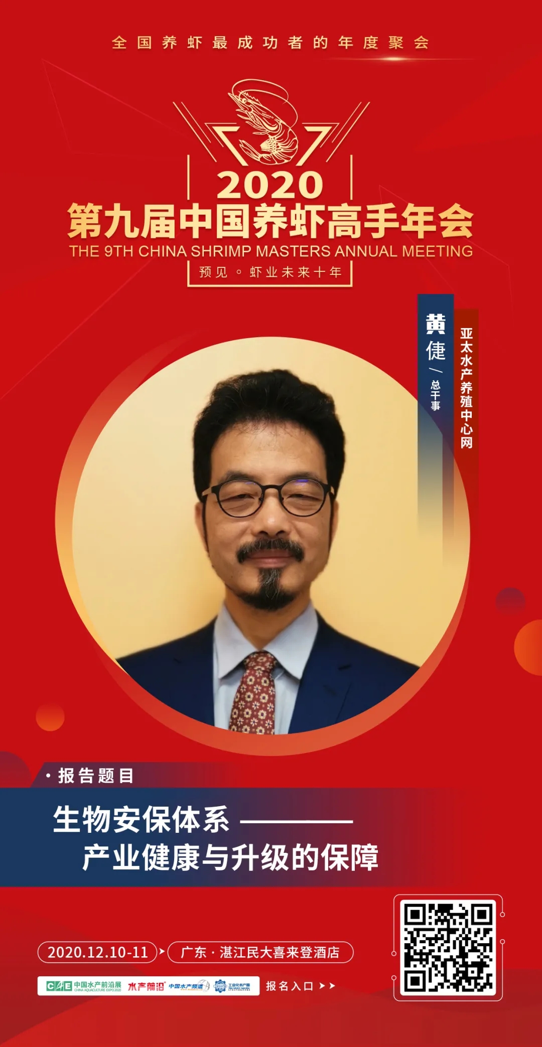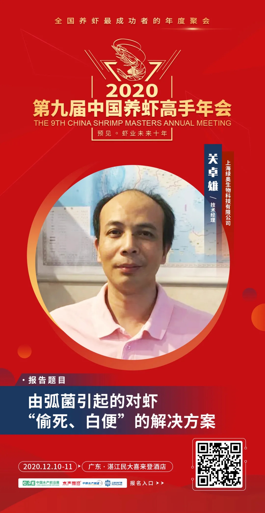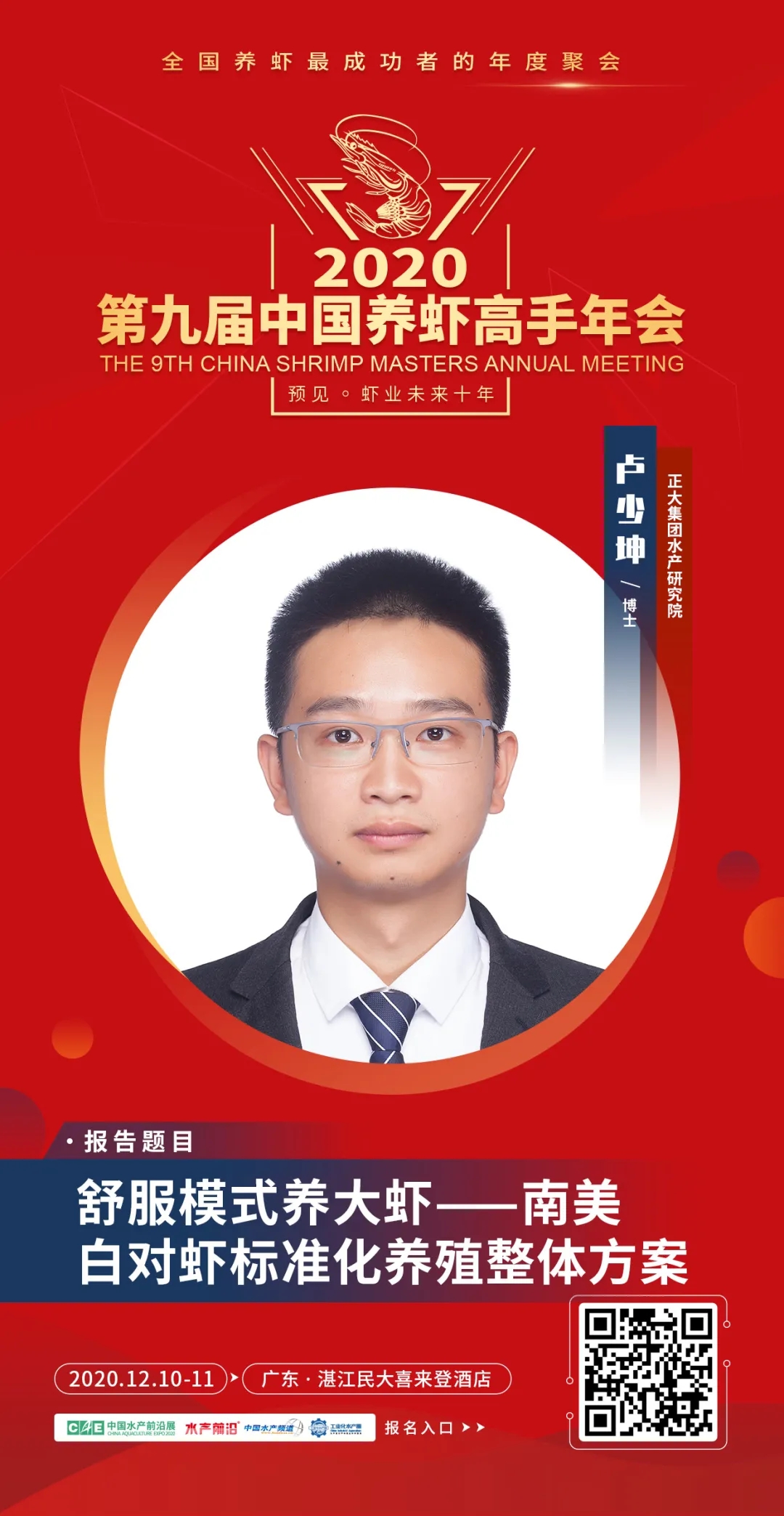 | 中國水產(chǎn)頻道報(bào)道, 15個(gè)議題報(bào)告+3場(chǎng)主題互動(dòng)論壇+60余家名優(yōu)企業(yè)展+“2020中國蝦業(yè)年度榜”頒獎(jiǎng)盛典+3場(chǎng)同期會(huì)議,12月10-11日,湛江見! 第九屆中國養(yǎng)蝦高手年會(huì) The 9th China Shrimp Masters Annual Meeting 全國養(yǎng)蝦最成功者的年度聚會(huì) 12月10-11日·湛江民大喜來登酒店 會(huì)議日程重磅發(fā)布 👇👇👇 行業(yè)翹首期待的“第九屆中國養(yǎng)蝦高手年會(huì)”定于2020年12月10-11日在廣東湛江舉行,本屆年會(huì)將以“預(yù)見蝦業(yè)未來十年”為主題,聚集蝦業(yè)各領(lǐng)域的頂級(jí)智慧,整合全球有效資源,議題將觸及對(duì)蝦業(yè)鏈條中包括種苗、飼料、動(dòng)保、設(shè)備、流通、消費(fèi)等利益相關(guān)者,主要內(nèi)容包括前沿育種育苗技術(shù)、新型養(yǎng)殖模式、飼料新配方、檢測(cè)新手段、病害防控新技術(shù)、新型養(yǎng)殖設(shè)備等關(guān)乎未來發(fā)展的問題展開。我們希望通過這種具有前瞻性的交流和自由討論,在科研、技術(shù)、產(chǎn)品、模式等多方面產(chǎn)生新想法、形成新趨勢(shì),共同展望中國蝦業(yè)未來10年,以推動(dòng)中國蝦業(yè)更健康、穩(wěn)定、持續(xù)的發(fā)展。 年會(huì)期間,還將舉行“2020中國蝦業(yè)年度榜”頒獎(jiǎng)盛典,擬推出“2020年中國蝦業(yè)二十強(qiáng)企業(yè)”、“2020年中國養(yǎng)蝦高手”、“2020年蝦業(yè)創(chuàng)新力產(chǎn)品”、“2020中國蝦業(yè)值得信賴品牌(分種苗、飼料、動(dòng)保、設(shè)備板塊)”等榜單,邀您一同見證! 年會(huì)同期舉行: 2020第二屆中國對(duì)蝦市場(chǎng)高峰論壇 第二屆中小水產(chǎn)料企技術(shù)創(chuàng)新與發(fā)展高峰論壇暨特種水產(chǎn)發(fā)展峰會(huì) 一、會(huì)議主題 預(yù)見蝦業(yè)未來十年 二、會(huì)議時(shí)間與地點(diǎn) 時(shí)間:2020年12月10-11日 地點(diǎn):廣東·湛江民大喜來登酒店 。ㄕ拷谐嗫矃^(qū)海濱大道北128號(hào)) 三、組織單位 指導(dǎo)單位: 國家蝦蟹產(chǎn)業(yè)技術(shù)體系 亞太水產(chǎn)養(yǎng)殖中心網(wǎng)絡(luò)(NACA) 主辦單位: 中國水產(chǎn)前沿展 承辦單位: 《水產(chǎn)前沿》雜志 工業(yè)化水產(chǎn)圈 協(xié)辦單位: 中海萬弘生物科技有限公司 廣東粵海飼料集團(tuán) 廣東遂溪縣好仕達(dá)實(shí)業(yè)有限公司 唐山三發(fā)普林飼料有限公司 廣東恒興飼料實(shí)業(yè)股份有限公司 上海綠奧生物科技有限公司 廈門源正龍生物科技有限公司 廣東旋達(dá)檢測(cè)技術(shù)服務(wù)有限公司 正大集團(tuán) 好潤集團(tuán) 銘治集團(tuán) 支持單位: 廣東海洋大學(xué)水產(chǎn)學(xué)院 廣東省漁業(yè)技術(shù)推廣總站 廣東水產(chǎn)學(xué)會(huì) 廣東漁業(yè)協(xié)會(huì) 中國水產(chǎn)科學(xué)研究院南海水產(chǎn)研究所 全球水產(chǎn)養(yǎng)殖聯(lián)盟(GAA) 國家工業(yè)化水產(chǎn)養(yǎng)殖與裝備科技創(chuàng)新聯(lián)盟 中國漁業(yè)協(xié)會(huì)水產(chǎn)動(dòng)保分會(huì) 海南省對(duì)蝦養(yǎng)殖協(xié)會(huì) 廣西對(duì)蝦養(yǎng)殖協(xié)會(huì) 浙江對(duì)蝦養(yǎng)殖協(xié)會(huì) 湛江市水產(chǎn)技術(shù)推廣中心站 湛江市對(duì)蝦苗種協(xié)會(huì) 如東縣南美白對(duì)蝦協(xié)會(huì) 金牌贊助單位: 青島海壬水產(chǎn)種業(yè)科技有限公司 海南海壹水產(chǎn)種苗有限公司 廣東海威水產(chǎn)養(yǎng)殖有限公司 廣東綠百多生物開發(fā)有限公司 煙臺(tái)大樂飼料有限公司 廣東海興農(nóng)集團(tuán)有限公司 海茂種業(yè)科技集團(tuán)有限公司 銀牌贊助單位: 安琪酵母股份有限公司 廈門喜大生物科技有限公司 廣州承興生物科技有限公司 上海義民電機(jī)有限公司 安迪蘇生命科學(xué)制品(上海)有限公司 臺(tái)州金湖機(jī)電有限公司 廈門君和誠生物科技有限公司 海南海聯(lián)水產(chǎn)種苗有限公司 眾合發(fā)(北京)生物科技發(fā)展有限公司 天津市漁生堂生物技術(shù)有限公司 山東寶來利來生物工程股份有限公司 廣州市利健藥業(yè)有限公司 廣州利洋水產(chǎn)科技股份有限公司 廣東海盟海洋生物科技有限公司 廣州華峰生物科技有限公司 湛江市粵凱生物科技有限公司 美國SIS(SHRIMP IMPROVEMENT SYSTEMS GROUP) 比利時(shí)英偉水產(chǎn)集團(tuán) 湛江騰飛實(shí)業(yè)有限公司 。ㄖ忻篮腺Y)四川納比生物科技有限公司 成都通威自動(dòng)化設(shè)備有限公司 海南寶萊海洋生物科技有限公司 江蘇漁樂圈生物工程有限公司 樂達(dá)(廣州)香味劑有限公司 手袋冠名: 湛江銀恒生物科技有限公司 礦泉水冠名: 海南中正水產(chǎn)科技有限公司 參會(huì)證冠名: 廣東恒興飼料實(shí)業(yè)股份有限公司 歡迎晚宴&抽獎(jiǎng)冠名: 廣東粵海飼料集團(tuán) 答謝晚宴&椅套冠名: 中海萬弘生物科技有限公司 更多贊助企業(yè)誠邀中…… 媒體支持: 中國水產(chǎn)頻道、海鮮指南、農(nóng)牧前沿、蝦蟹前沿、今日頭條、抖音、快手、網(wǎng)易新聞、養(yǎng)魚世界、農(nóng)牧世界 四、報(bào)告嘉賓與簡介 報(bào)告題目:對(duì)蝦主要病害防控技術(shù)及未來發(fā)展方向 報(bào)告嘉賓:國家蝦蟹產(chǎn)業(yè)技術(shù)體系首席科學(xué)家、中山大學(xué)何