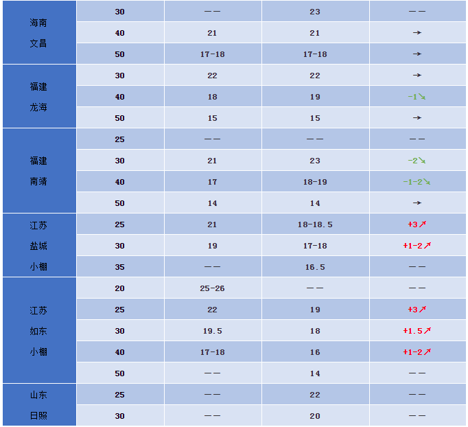 文/圖 水產(chǎn)前沿 植銀素 本周要聞及行情 中國水產(chǎn)頻道原創(chuàng)報(bào)道,上周,我們說到江蘇地區(qū)蝦價(jià)近兩月一直呈現(xiàn)下滑態(tài)勢,但到11月底鹽城、連云港等地常溫蝦出售已經(jīng)尾聲,供求關(guān)系逐漸變化,價(jià)格稍有回暖;如東地區(qū)部分養(yǎng)殖戶開始加溫,上周兩地蝦價(jià)開始回溫。果不其然,本周如東蝦價(jià)開始全面上漲!據(jù)了解,目前如東縣內(nèi)單膜棚已基本結(jié)束,雙膜棚銷售也已經(jīng)到半數(shù),全縣預(yù)計(jì)4成蝦已經(jīng)出售。隨著蝦價(jià)回升,賣蝦速度也相對減緩,流通商表示現(xiàn)在有蝦的小棚外面都排滿了抓蝦車,漲價(jià)速度很快,可以說是一天一個價(jià)!鹽城地區(qū)蝦價(jià)對比上周也有明顯上漲,但是當(dāng)?shù)鼗窘饨猜暎芸炀徒Y(jié)束了。 本周珠三角地區(qū)蝦價(jià)較為平平,在周三的時(shí)候大蝦價(jià)格呈現(xiàn)明顯上漲,現(xiàn)在又保持平穩(wěn)。中山地區(qū)中小蝦稍有下滑。陽江、湛江兩地目前蝦價(jià)變化不大,因?yàn)閺V西地區(qū)仍有少量存塘蝦在售,陽江養(yǎng)殖戶表示要等到月底,廣西活蝦售罄,當(dāng)?shù)匚r價(jià)才會有所上漲的。廣西目前北海、欽州蝦價(jià)都保持穩(wěn)中有漲態(tài)勢。 福建地區(qū)蝦價(jià)則是不理想,養(yǎng)殖戶表示今年冬棚投苗密度大,發(fā)病嚴(yán)重,很多塘口迫收,加上很多福建車輛上江蘇抓蝦,福建的蝦只在省內(nèi)流通,需求有限,價(jià)格有跌不漲! 對于后市,您有何見解,歡迎文末留言! 各地白對蝦價(jià)格一覽 說明:上述報(bào)價(jià)可能會因區(qū)域、規(guī)格、品質(zhì)和時(shí)間等因素的不同而會產(chǎn)生差異,在此僅供參考。 編號:dxbj2020-12-5 |