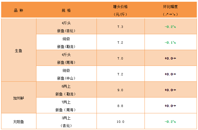 文/ 水產前沿 何鴻浩 生魚 中國水產頻道原創報道,順德杏壇:本周大魚6-7成統級發價7.0-7.5元。新魚開始上市,3-4成左右新魚發價6.0-6.5元/斤。此外,近期轉季天氣,建議做好殺蟲、改底工作。 勒流區域:新魚5成統級6.0元/斤左右,身材差的報價5.7元/斤左右;舊魚7成發價7.2元/斤。可根據自身情況考慮出魚,若無出魚計劃需做好改底、肥水工作。 南海西樵九江:目前價格維穩,舊魚統貨6-8成大魚發價7.2-7.7元/斤,分級抓2斤上8元/斤,2斤下5.8元/斤;新魚統貨發價6元/斤,后續元旦等節假日到來,需求量會有一定量上升。 中山區域:本周魚價穩定,舊魚2斤上規格大魚8.0-8.1元/斤;2斤下5.7元/斤;7-8成大魚統貨7.4-7.6元斤;新魚4-5成統貨6.3-6.5元/斤。最近大范圍降溫,對魚價是個機會,但需要做好魚塘冬季管理工作,以減少損耗。 |