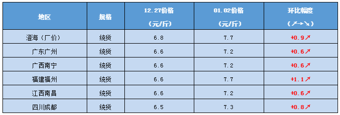 文/ 水產前沿 陳曉慶 牛蛙行情 中國水產頻道原創報道,今日牛蛙收購價(廠價):統貨7.7元/斤。 從本周三開始,牛蛙價格就一直“漲”聲不斷。本周三,牛蛙廠家廣寶率先發布漲價通知,2020年12月30日起,牛蛙收購單價調整為7元/斤,大中蛙一樣價。昨天下午,牛蛙廠家源信也發布了漲價通知,從2020年1月2日起,源信公司牛蛙收購價格調整為:7.7元/斤。 今日,又有兩家公司發布了牛蛙漲價通知,目前牛蛙收購價最高8元/斤。 現金價格方面,隨著廠價的上漲,現金價也跟著一起上漲,今天價格普遍在7.2-7.3元/斤左右。 目前湖南、湖北、江西、四川等地都缺少大蛙中蛙,廣西蛙也出的差不多了,只剩下廣東澄海的蛙在陸陸續續上市。據了解,澄海2020年牛蛙投苗量增加20%-25%,但今年普遍不好養,成活率低,產量預計并沒有多大的增長。現在其他地區牛蛙存量并不多,澄海蛙主導市場,業內普遍看好澄海今年這一批蛙的價格。 另一方面,元旦小長假對于消費的回升也有不小的推動作用。 值得一提的是,由于去年上半年牛蛙價格的持續走高,2020年下半年澄海之外各地的牛蛙養殖面積及投苗量都有所增長。 養殖有風險,投資需謹慎。 牛蛙價格(現金價) 備注:價格隨區域以及規格大小有所差異,僅供參考,具體價格請以當地牛蛙收購商為準。 黑斑蛙行情 本周黑斑蛙價格繼續保持穩定。目前黑斑蛙受制于市場因素,酒店、家庭消費還未完全打開,價格一時間難以上漲。 黑斑蛙價格 |