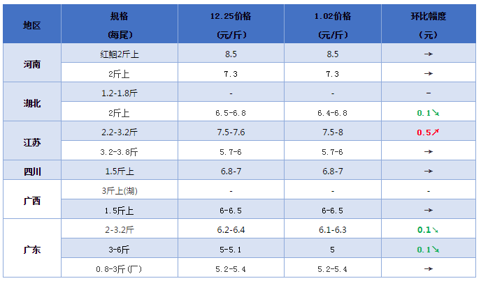 文/ 水產前沿 曾鈴程 2020年鮰魚行情走勢 整體行情綜述 中國水產頻道原創報道,節日效應對叉尾銷量有一定拉升,但是大量魚待售,魚中不愁沒貨,整體行情輕微下調1-2毛。不過例如江蘇因為今年天冷,水面很多結冰,冬天拉魚要價會更高一些,北京貨有報8塊。而像主產區四川,因為外地貨的沖擊,成都市場的價格反而不如周邊價高,利潤低本地魚商還不愿意去。 各產地行情分析 河南地區:據海淞水產權沾公、曾紅棉消息,本地2斤上規格黑鮰塘頭價7.3元/斤,紅鮰8.5元/斤。萬邦市場魚商行報價,外地貨2-3斤批發價6.8-7元/斤,超大5.7-5.8元/斤,行情穩定。 湖北地區:行情穩定,塘頭價格標魚一般6塊4,紅鮰7塊,都有所下行,對外地行情也有一定沖擊。 江蘇地區:江蘇行情因為水面封冰,出魚減少,北京貨有報8元,超大有報6元,統貨5塊。外地拉江蘇3-6斤的報5.1元左右。 四川地區:周邊穩定,標魚6.8-7元/斤。外地貨沖擊,成都本地拉魚價格壓低,甚至標魚6塊6,而周邊價格更高能到7塊。 兩廣地區:廣東價格下調1毛,1.3~3.5斤,5.6元/斤;1.8~3.2斤,6.1元/斤;2~3斤,6.3元/斤。出魚太多,魚中不愁沒貨,反愁銷路。廣西穩定,網箱2斤標魚7塊,塘魚6.7塊,統貨6塊。 鮰魚報價 說明:1.上述價格及行情分析僅供參考,市場有風險,入市需謹慎 2.塘頭價指從池塘抓魚價格,紅鮰指紅色斑點叉尾鮰,黑鮰指黑色斑點叉尾鮰 編號:hybj2021-01-02 助力鮰魚產業發展,特別感謝各位熱心朋友的信息支持和指點幫助! |