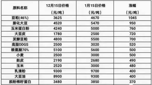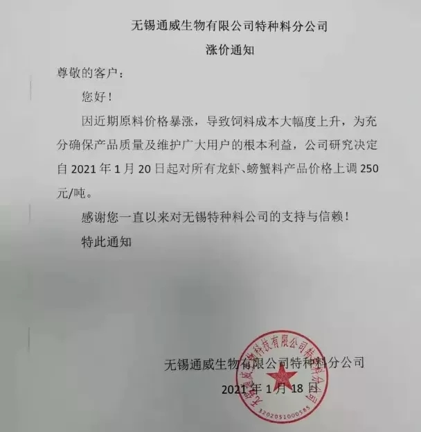 | 中國水產頻道綜合報道, 豆粕漲瘋了,飆到4670元/噸,大破歷史記錄 連日來,原料價格漲瘋了!2021年1月16日,豆粕已漲破4000元/噸,部分地區報價更是高達4670元/噸,破了歷史最高記錄4500元/噸,月漲幅超過1000元/噸。今天,飼料市場再次傳來料價瘋漲的消息,每噸最高上漲600元!水產料方面,漲得最猛的就是蝦蟹料。近日,水產前沿最新收到揚州通威、南通巴大、無錫通威、九江大北農、武漢大北農、湖南神爽以及荊州格力特等公司漲價龍蝦、螃蟹料消息。具體如下: 揚州通威飼料有限公司漲價通知 無錫通威飼料有限公司漲價通知 南通巴大飼料有限公司漲價通知 九江大北農水產科技有限公司漲價通知 武漢大北農水產科技有限公司漲價通知 湖南神爽水產科技有限漲價通知 荊州格力特生物科技有限公司漲價通知 豆粕漲至4670元/噸,月漲幅超過1000元/噸 1月18日又有料企宣布漲價,最高漲600元/噸 不瘋狂不成魔!過去的一年,乃至剛剛步入新的一年,飼料價格一直走在刷新歷史的路上...玉米突破1.5元回落后在攀高峰1.53元,豆粕出廠價達到4150元,賴氨酸、蘇氨酸市價創5年新高等,原料上漲飼料企業無奈只能跟隨,飼料漲價潮持續襲擊...有企業甚至一次大幅度上調600元。 1.53元/斤,玉米行情節節攀升! 元旦過后,山東、河南等地玉米價格持續上漲,一改往日東北獨角戲劇情,要知道2020年11-12月一直是東北地區玉米價格上漲的。進入21年1月10日左右,山東多家企業價格成功突破1.5元大關,其中,昌樂英軒更是給出了1.515元每斤的高價,創下新的歷史記錄。但好景不長,市場逐步供貨增多,玉米價格很快跌破1.5元。 1月16日,山東地區玉米價格再次上漲至1.5元,山東玉米最高收購價格至1.53元,最主要的原因就是貿易商賣糧積極性減少,且目前玉米市場的話語權多掌握在貿易商手中。 豆粕已經破4000元,部分高達4670元 2021年1月16日,豆粕已漲破4000元/噸,部分地區報價更是高達4670元/噸,月漲幅超過1000元/噸。 魚粉平靜多日后大幅上漲500元 我國魚粉上海、廣州、大連等地魚粉價格穩定,天津港庫存偏低推動魚粉價格大幅度上漲,為500元/噸。其中秘魯超級蒸汽魚粉在11400-11600元/噸,天津港報價區間在12000-12100元/噸。 賴氨酸、蘇氨酸市價創5年新高 由于廠家發貨慢,賴氨酸、蘇氨酸、色氨酸市場供應偏緊,又值采購需求增加之時,報價大幅度上漲,截至目前,98%賴氨酸市場報價10.8-12元/公斤,70%賴氨酸市場報價5.5-6元/公斤,蘇氨酸市場報價14.5-16元/公斤,創5年來新高,色氨酸市場報價漲至66-70元/公斤。 原料價格紛紛上漲,飼料價格全面暴漲 由于近來玉米、豆粕、豆油、賴氨酸、魚粉、乳清粉、麩皮、維生素等原料價格紛紛上漲,飼料企業成本上升,為了保證產品質量,本月多家飼料企業上調飼料價格,一月之內就多大四次調價,最高達到600元/噸。其中包括的廠家有正大、新希望、大北農、安佑等。(本文轉自【飼料行業信息網、水產前沿、改變飼界】。如有版權問題,敬請聯系wx@fishfirst.cn。) |