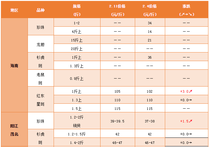 文/ 水產前沿 何鴻浩 行情簡析 中國水產頻道原創報道,廣東地區:本周廣東地區珍珠價格有明顯上漲,陽江、茂名、湛江地區均上漲。2月11日,陽江、茂名地區1.2-2斤統貨規格珍珠達39-39.5元/斤,上漲1.5元/斤。2月11日湛江1-2斤統貨規格珍珠報價為38-39元/斤,上漲2元/斤。2月12日(今日),湛江石斑魚價格飆漲,珍珠2成中魚42元/斤,3成以上43元/斤,為近2年的歷史價格高點。 海南地區:海南地區石斑魚因春節效應市場明顯好轉,價格對比上周有所上漲,其中2月11日紅東星斑銷量上漲,紅火體色受市場歡迎,1斤上規格105元/斤,上漲3元/斤,1.3斤上規格110元/斤,1.5斤上規格115元/斤。 其他地區:部分地區因為流通商休息的緣故,市場抓魚少,故暫無報價。當地業者表示,一年忙碌到頭也需要休息一下,工作也不能忘記家里人,休息幾天才會繼續開工。另外,也有部分養殖戶今年存塘魚少,所以選擇早早抓完魚過大年。 業內人士分析,近日多條魚蝦價格暴漲,這或與很多人留在城市過年,加大了水產品消費,拉高了價格有關。 本周各地石斑魚報價 特別感謝:海南晨海水產有限公司、海南大順發水產有限公司、 中泰水產批發行、萊州明波水產有限公司、廣東上上生物科技有限公司、廣東大順發水產有限公司、福建藝祺水產養殖有限公司、逸源水產科技有限公司、涌益水產專業合作社對本文大力支持! |