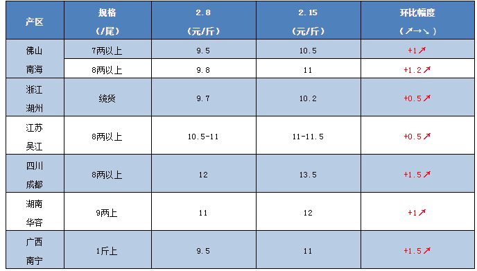 文/圖 何氏水產、水產前沿 李靜 中國水產頻道原創報道,1、本周佛山加州鱸價格漲幅明顯,7兩上報價10.5元/斤,比上周上漲了1元/斤;8兩上報價11元/斤,比上周上漲了1.2元/斤;具體還是看魚頭定價,價格按上車規格、塘魚質量情況略有調整。春節期間銷量暴漲,每天比平時多出2倍的流通量。節后從昨天開始銷量恢復的平日水平,預計接下價格也會有小幅的下滑。 2、湖州本周統貨報價9.7元/斤,比上周上漲了0.5元/斤。 3、江蘇吳江本周價格跟上周一樣,8兩上報價11-11.5元/斤,比上周上漲了0.5元/斤。價格會根據魚頭大小及規格比例多少略有調整。 4、四川成都今天報價8兩上13.5元/斤,比上周漲了1.5元/斤; 5、湖南華容本周價格9兩上報價是12元/斤,比上周上漲了1元/斤。節后銷量恢復到平日。 6、廣西南寧本周價格比上周上漲了1.5元/斤,報價是11元/斤。 各地區加州鱸出塘價 |