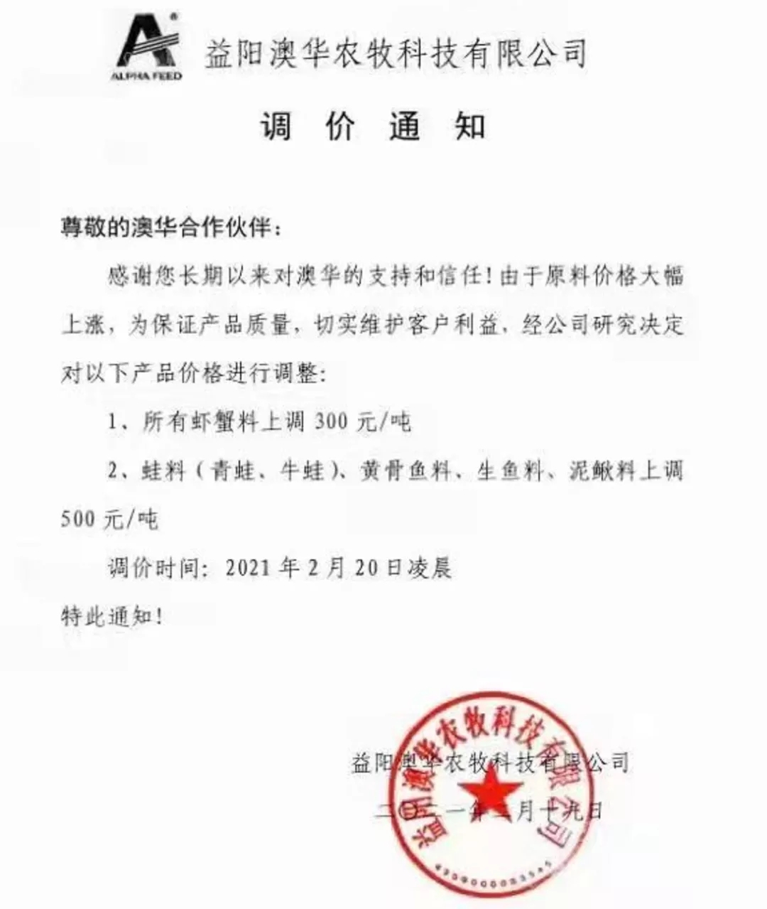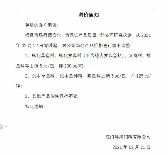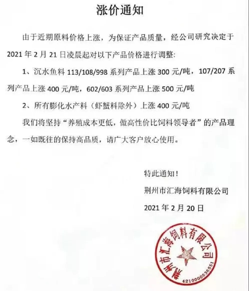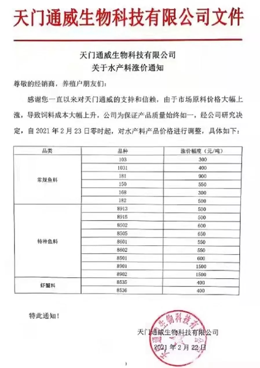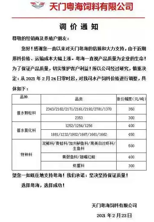 | 中國(guó)水產(chǎn)頻道報(bào)道, 水產(chǎn)料真是漲瘋了!一大波料企上調(diào)料價(jià),最高漲1500元/噸,海大卻降300元/噸 今天(2月23日),又一大波水產(chǎn)飼料企業(yè)宣布漲價(jià)! 前天,我們報(bào)道了牛年水產(chǎn)料第一漲,漲價(jià)集團(tuán)巨頭有海大、澳華、粵海等,最高漲500元/噸,引發(fā)了行業(yè)巨大關(guān)注。昨天(2月23日),我們又收到不少大集團(tuán)企業(yè)漲價(jià)的消息,有通威、大北農(nóng)、粵海、恒興、禾豐和匯海集團(tuán)料企。漲價(jià)的區(qū)域仍是華中地區(qū),漲價(jià)的品種有常規(guī)魚(yú)料、特種魚(yú)料、蝦蟹料,還有石斑魚(yú)料、南美白對(duì)蝦料......今天的這一輪漲價(jià)可謂“猛烈”,常規(guī)魚(yú)料一次就暴漲900元/噸、特種魚(yú)料暴漲竟達(dá)1500元/噸,真的很瘋狂! 其中天門(mén)通威漲價(jià)通知表示,由于市場(chǎng)原料價(jià)格大幅上漲,導(dǎo)致飼料成本大幅上漲,公司為保證產(chǎn)品質(zhì)量始終如一,經(jīng)公司研究決定,自2021年2月23日零時(shí)起,常規(guī)魚(yú)料漲價(jià)幅度為300-900元/噸、特種魚(yú)料漲價(jià)幅度為500-1500元/噸、蝦蟹料漲價(jià)400元/噸。而在1月份,天門(mén)通威生物科技有限公司已2次上漲蝦蟹料的價(jià)格,一次在1月1日,漲價(jià)250元/噸、1月27日漲價(jià)300元/噸,這樣累計(jì)三次蝦蟹料漲價(jià)總計(jì)達(dá)到了950元/噸! 其余的料企,如大北農(nóng)、粵海、匯海等蝦蟹料均為第二次漲價(jià),2次合計(jì)漲幅一般都在550-600元/噸。 除了今天漲價(jià)的料企外,漢川恒興也加持發(fā)布了明天(2月24日)漲價(jià)的消息,淡水魚(yú)料、特種魚(yú)料、蛙料全部漲400元/噸。 另?yè)?jù)荊州禾豐飼料負(fù)責(zé)人則中國(guó)水產(chǎn)頻道表示,禾豐飼料在牛年前已經(jīng)通知漲價(jià),根據(jù)最新原料行情走勢(shì),很可能在短期內(nèi)要對(duì)魚(yú)顆粒料膨化料作繼續(xù)跟漲100-200元/噸的意向。 令行人意外和尋味的是,就在眾多料企強(qiáng)勢(shì)上調(diào)料價(jià)之際,荊州海大卻宣傳在今天(2月23日)對(duì)所有的蝦蟹料產(chǎn)品降價(jià)消息,每噸下調(diào)300元/噸。 但其實(shí)說(shuō)意外也不是太意外,因?yàn)橄抡{(diào)飼料價(jià)格的不只是荊州海大一家,還有東北沈陽(yáng)揚(yáng)翔飼料廠(chǎng)已在前幾天發(fā)布通知:2月18日對(duì)豬飼料價(jià)格下調(diào)60-150元/噸。據(jù)飼料行業(yè)信息網(wǎng)信息,目前原料的玉米仍表現(xiàn)強(qiáng)勢(shì)和漲價(jià),今天最高再100元/噸,但豆粕大漲大跌都很難,窄幅波動(dòng)是主旋律。 附:企業(yè)最新漲價(jià)通知 天門(mén)通威生物科技有限公司漲價(jià)通知 揚(yáng)州通威飼料有限公司漲價(jià)通知 湖南粵海飼料有限公司調(diào)價(jià)通知 天門(mén)粵海飼料有限公司調(diào)價(jià)通知 宜昌陽(yáng)光飼料有限責(zé)任公司調(diào)價(jià)通知 武漢大北農(nóng)水產(chǎn)科技有限公司 漢川恒興飼料有限公司調(diào)價(jià)通知 荊州禾豐農(nóng)業(yè)科技有限公司調(diào)價(jià)通知 湖北匯海農(nóng)牧科技有限公司漲價(jià)通知 荊州市匯海飼料有限公司漲價(jià)通知 兩料企降價(jià)通知: 荊州海大飼料有限公司降價(jià)通知 沈陽(yáng)揚(yáng)翔飼料有限公司調(diào)價(jià)通知 附:牛年企業(yè)漲價(jià)回顧 天門(mén)海大飼料有限公司調(diào)價(jià)通知 湖南洞庭海大飼料有限公司漲價(jià)通知 武漢澳華農(nóng)牧科技有限公司調(diào)價(jià)通知 益陽(yáng)澳華農(nóng)牧科技有限公司調(diào)價(jià)通知 江門(mén)粵海飼料有限公司調(diào)價(jià)通知 海大在降價(jià),未來(lái)水產(chǎn)料市場(chǎng)的主流態(tài)勢(shì)是降還是漲? 據(jù)業(yè)內(nèi)人士表示,現(xiàn)玉米仍然持續(xù)高位局部上漲,豆粕短期沒(méi)有大幅調(diào)整 ,但是目前判斷飼料價(jià)格反轉(zhuǎn)為下調(diào),為時(shí)過(guò)早。但水產(chǎn)料上,荊州海大邁出了降價(jià)第一步,你認(rèn)為未來(lái)水產(chǎn)料市場(chǎng)的主流態(tài)勢(shì)是降還是漲呢?歡迎大家投票或在留言區(qū)發(fā)表評(píng)論意見(jiàn)。(本文轉(zhuǎn)自【中國(guó)水產(chǎn)頻道】。如有版權(quán)問(wèn)題,敬請(qǐng)聯(lián)系wx@fishfirst.cn。) |