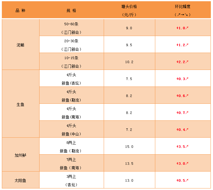 中山區域:舊魚2斤上規格大魚8.8-9.5元/斤,2斤下6.5-6.8元/斤,7-8成大魚統貨8.3-8.8元斤;新魚6成統貨7.5-8元/斤。最近市場流通需求大,價格上漲,養殖戶很多持觀望心態,對后市行情看好。