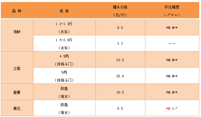 文/ 水產(chǎn)前沿 何鴻浩 中國(guó)水產(chǎn)頻道原創(chuàng)報(bào)道,鱸魚:本周魚價(jià)同比上周稍有上漲,1.4斤規(guī)格以下以水車為主,價(jià)格在8元/斤。1.5斤以上以冰車為主,1.5-2斤價(jià)格在7.7元/斤,2-2.5價(jià)格7.9元/斤。 立魚:本周立魚價(jià)格與上周持平,存塘量減少。 盲曹:目前存塘減少,后續(xù)行情看漲。 黃花:目前市場(chǎng)行情相比年前價(jià)格有所回升,主要表現(xiàn)為級(jí)魚6.5元左右,中魚6元左右。由于加工廠年前備貨較充足,且市場(chǎng)上黃花存塘多以中、大魚為主,導(dǎo)致大魚價(jià)格仍在5元左右波動(dòng)。看好市場(chǎng)級(jí)魚和中魚的走勢(shì)。 |