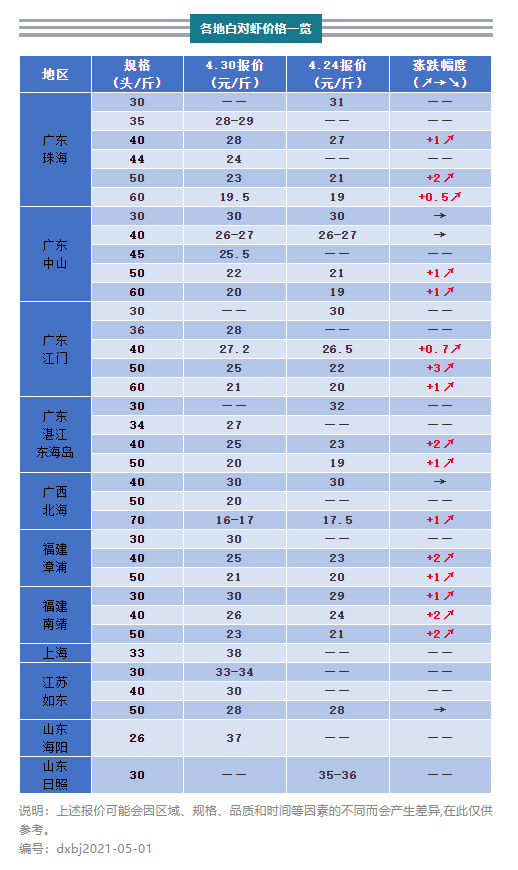 | 中國水產頻道原創報道, 對蝦節前漲勢延續,蝦價全線飄紅 文/水產前沿植銀素 本周要聞及行情 “五一”節假日終于來了,近兩天蝦市可以說是紅紅火火。珠三角養殖戶反映,近期蝦中要蝦挺積極的,只要不是發病蝦,價格對比上周一已經有2元/斤的漲幅。而批發市場也傳出搶蝦,蝦不夠賣的聲音,導致塘頭價升高,尤其補倉價格頗高。 趁著蝦價走高,養殖戶出蝦比較積極,也有人擔心“五一”之后價格回落,所以在近期應該出蝦的養殖戶不少,而病蝦相對來說還是低價,另外,30頭規格的蝦不如35-45頭的吃香。粵西的陽江高位池蝦不少,價格一直維持比較穩定,算中等水平;湛江地區活蝦開始漲起來了,而且凍廠收蝦也不少,目前到西南市場的蝦價格較好,比流通本地市場高3元左右,40頭活蝦在近兩天有2-3元漲幅。 廣西地區中小蝦價格下滑,但是40頭能賣出30頭左右的價格,只要是近期當地蝦塘病害嚴重,多發紅體和偷死,很多70-100頭的病蝦被迫上市,勢必會影響正常蝦價。 福建地區在節假日氛圍影響下,價格穩定上漲,省內普遍有1-2元/斤的漲幅。此外,有養殖戶反饋,黃金周假期很多婚宴也提上日程,酒店、餐飲的活蝦訂單增多了,有利于提高蝦價整體水平。江蘇如東地區大量鍋爐蝦市場,暫時沒有上漲的趨勢,但是價格還算維穩。山東地區蝦少,車多,訂單也不少,蝦價穩定上漲近兩周,養殖戶普遍看好“五一”市場。 |