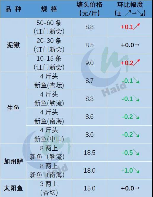 文/ 海大集團珠海海龍、水產前沿 聯合發布 生魚 水產前沿網原創報道,順德杏壇:受高溫運輸損耗大以及廣東疫情影響,魚價停滯不前。 勒流區域:6月第一周,生魚行情繼續陰跌,主要為2斤上規格大魚價格下跌,而中魚價格依然堅挺。同時,因為現在高溫運輸損耗較大,流通商整體下調了塘頭發價。 南海西樵九江:因疫情影響,本周魚價些許下滑,目前2斤上規格大魚發價9.2元/斤左右,2斤下規格發價8.5元/斤左右,舊魚7-8成大魚統貨發價9.0-9.2元/斤,新魚5-7成大魚統貨發價8.4-8.8元/斤。當前處于高溫出魚難階段,建議養殖戶做好水質、體質管理,為出魚或后續行情打好基礎。 中山區域:受疫情及高溫影響,魚價小幅下降,2斤上7成比例大魚價格平均在9.3元/斤,中魚8.3-8.4元/斤。 |