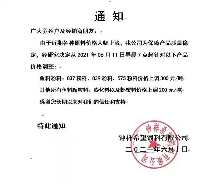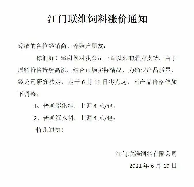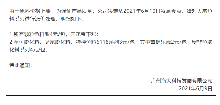 昨天,海大旗下幾大子公司珠海海龍、廣州海大、廣州海維、高要海大、新會奧特等同步上調普通淡水魚料價格,這是自5月11日在業中第一個挑起漲價企業,在不足一個月內又一次高調宣布飼料漲價,引發了行業不小震動、高度關注以及各種猜測。