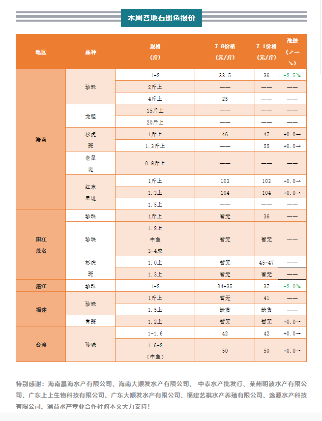 | 中國水產頻道原創報道, 本周石斑魚穩中帶跌,海南、廣東地區珍珠斑持續下滑 文/水產前沿 何鴻浩 行情簡析 海南地區:本周海南地區石斑魚領跌全國,其中珍珠斑下滑幅度較大。目前珍珠1斤上規格報價33.5元/斤,下跌2.5元/斤;紅東星斑與上周持平,1斤上規格報價103元/斤,1.3斤上104元/斤;衫虎斑保持穩定,1斤上規格報價47元/斤,1.3斤上規格報價55元/斤。海南流通業者表示,現在海南市場上1-2斤規格的珍珠都不缺,缺的是交易量,希望過了淡季生意能好一些。至于價格方面,今年魚少,跌破30元/斤的可能性很小。 廣東地區:本周廣東地區石斑魚價格同樣下滑。湛江地區珍珠斑1斤上規格報價34元/斤,下跌3元/斤。當地從業者表示,這周一的時候價格還穩定在36元/斤左右,大家出魚積極性不高,而這兩天價格又松動了。另外值得注意的就是6-10斤的大規格魚漲了,說明市場還是有所變化的。 福建地區:本周福建石斑魚暫無報價,主要原因為當下市場較為混亂,價格不穩定。當地從業者表示,這幾天非常被動,不好開價,而且經常一天一個價,昨天剛開價抓魚,今天價格就跌下去了,根本沒法做生意。關于珍珠斑價格是否會跌破30元/斤關口,多位業者表示可能性不大,認為跌到目前價位已經夠低了,價格應該不會再進一步下滑。 臺灣地區:本周臺灣地區珍珠斑價格呈現出穩定的情況,小規格珍珠斑報價為42元/斤,中魚珍珠規格報價50元/斤。當地業者表示,雖然本地價格維穩,但對其實市場的價格走勢非常無語,擔憂會影響到臺灣的后續走勢。另外有業者坦言,此輪降價也有部分人見市場不好,降價拋售的原因。 |