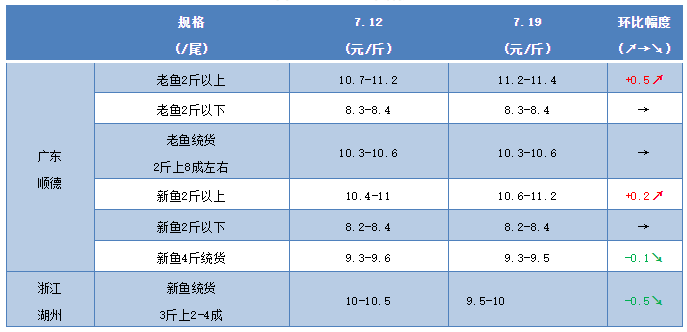 文/圖 何氏水產(chǎn)、水產(chǎn)前沿 黃家茵 生魚 水產(chǎn)前沿網(wǎng)原創(chuàng)報(bào)道,本周廣東生魚老魚2斤以上11.2-11.4元/斤,比上周上漲了0.5元/斤;2斤以下報(bào)價(jià)8.3-8.4元/斤,跟上周一樣;老魚統(tǒng)貨2斤上8成左右報(bào)10.3-10.6元/斤,保持不變。新魚4斤統(tǒng)貨9.3-9.5元/斤,比上周稍微下跌了0.1元/斤;新魚2斤上報(bào)價(jià)10.6-11元/斤,比上周上漲了0.2元/斤; 2斤以下報(bào)價(jià)8.2-8.4元/斤,跟上周一樣。每塘魚的最終成交價(jià)格都是根據(jù)魚頭大小以及2斤以上成數(shù)來決定的。廣東生魚上周的市場行情主要是大魚銷量好,價(jià)格有小幅的上漲,銷量比之前多。小魚價(jià)格比較穩(wěn)定,市場需求量比較穩(wěn)定。接下來大魚還會(huì)保持高位運(yùn)行,小魚價(jià)格暫時(shí)穩(wěn)定。 各地區(qū)生魚出塘價(jià) 備注:生魚因魚頭大小導(dǎo)致成交價(jià)格會(huì)有一定幅度的波動(dòng) |