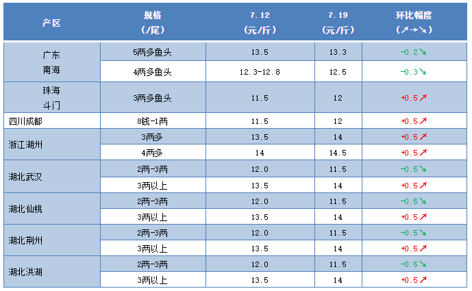 文/圖 何氏水產(chǎn)、水產(chǎn)前沿 黃家茵 黃顙魚 水產(chǎn)前沿網(wǎng)原創(chuàng)報(bào)道,本周各地黃顙魚本周價(jià)格漲跌占半,本周廣東黃顙魚5兩多魚頭報(bào)價(jià)13.3元/斤,比上周稍微下跌了0.2元/斤;4兩多魚頭報(bào)價(jià)12.5元/斤,比上周也下跌了0.3元/斤;3兩多魚頭12元/斤,比上周上漲了0.5元/斤。銷量跟上周沒有明顯的上升,小魚需求量增加,接下來價(jià)格變化不大。 浙江湖州黃顙魚本周價(jià)格,3兩多魚頭14元/斤,比上周上漲了0.5元/斤;4兩多魚頭報(bào)價(jià)14.5元/斤,比上周也上漲0.5元/斤;當(dāng)?shù)爻鲷~量比較大,接下來價(jià)格還會穩(wěn)中有升。 湖北黃顙魚2-3兩多魚頭價(jià)格在11.5元/斤,比上周再下跌0.5元/斤,3兩以上報(bào)價(jià)14元/斤,比上周上漲了0.5元/斤。銷量跟上周差不多,大魚需求量相對大一些,后市價(jià)格變化不大。 各地區(qū)黃顙魚出塘價(jià) 備注:黃顙魚因魚頭大小與3兩上大骨所占的具體比例導(dǎo)致成交價(jià)格會有一定幅度的波動 |