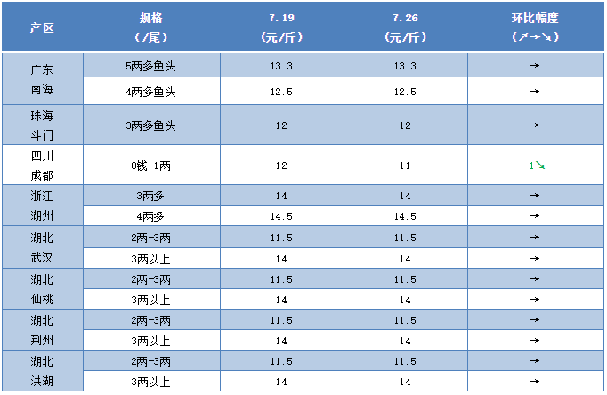 文/圖 何氏水產(chǎn)、水產(chǎn)前沿實習(xí)編輯 黃家茵 水產(chǎn)前沿網(wǎng)原創(chuàng)報道,1、本周各地黃顙魚價格基本持平,本周廣東黃顙魚5兩多魚頭報價13.3元/斤;4兩多魚頭報價12.5元/斤;3兩多魚頭12元/斤,比上周上漲了0.5元/斤。銷量跟上周沒有明顯的上升,小魚需求量增加,接下來價格變化不大。 2、浙江湖州黃顙魚本周價格,3兩多魚頭14元/斤;4兩多魚頭報價14.5元/斤。 3、湖北黃顙魚2-3兩多魚頭價格在11.5元/斤,3兩以上報價14元/斤。銷量跟上周差不多,大魚需求量相對大一些,后市價格變化不大。 各地區(qū)黃顙魚出塘價 備注:黃顙魚因魚頭大小與3兩上大骨所占的具體比例導(dǎo)致成交價格會有一定幅度的波動 |