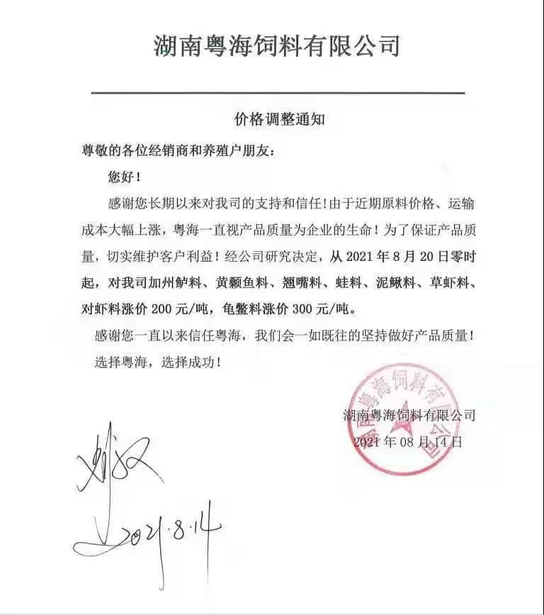 文/ 水產(chǎn)前沿 整理 水產(chǎn)前沿網(wǎng)原創(chuàng)報道,受疫情影響,多省如江蘇、湖南、河南等飼料原料、飼料成品、商品魚蝦運輸困難,運費翻倍暴增,如江蘇隨著司機流動量大,行程碼上帶星(去過中低風險)的司機越來越多,就都要48小時核酸檢測。知情人士稱,現(xiàn)在能跑的司機越來越少了運費翻倍暴漲,7-8天(或更長時間)才找到一輛運料車。 另外,進入8月來,水產(chǎn)養(yǎng)殖正值投料旺季,原料價格也在上漲,除了上述地區(qū)飼料價格大漲外,還有廣西、山東等地也漲了,這一波又接一波的,根本停不下來...... 華東飼料持續(xù)漲價,今天最高漲300元/噸 據(jù)了解今天(8月15日),華東地區(qū)有部分料企上漲對蝦料(普通料和高端料)、蝦蟹料,漲幅為對蝦普通料上漲200元/噸、對蝦高端料上漲300元/噸、蝦蟹料上漲150元/噸。 寧波天邦飼料漲價通知 江蘇海大日前漲價通知 華中8月20日特水魚、蝦料、龜鱉料漲價,最高漲300元/噸 此外,華中湖南地區(qū)也在持續(xù)漲價,昨天湖南粵海發(fā)布漲價消息,由于近期原料價格、運輸成本大幅上漲,從2021年8月20日零時起,加州鱸料、黃顙魚料、翹嘴料、蛙料、泥鰍料、草蝦料、對蝦料漲價200元/噸,龜鱉料漲價300元/噸。 湖南粵海飼料漲價通知 疫情影響,物流成本、原料價格上漲,河南飼料漲價100元/噸 同樣,在河南地區(qū),因疫情影響,物流成本、原料價格上漲,飼料成本大幅上升,8月11日起,多個料企包括開封海大、河南康達爾、河南大德、河南王牌、河南金碩康都同步上漲了顆粒料、膨化料,漲幅為100元/噸。 開封海大飼料漲價通知 河南康達爾飼料漲價通知 河南大德飼料漲價通知 河南王牌飼料漲價通知 河南金碩康飼料漲價通知 山東蝦料、蝦蟹料漲300元/噸 8月13日,青島六和飼料有限公司、海陽新希望六和飼料有限公司兩個料企,同一個聚落發(fā)布漲價通知,蝦料、蝦蟹料均漲300元/噸。 膠東聚落飼料漲價通知 13日,廣西普通魚料(苗料)漲3元/包 廣西澳華飼料漲價通知 |