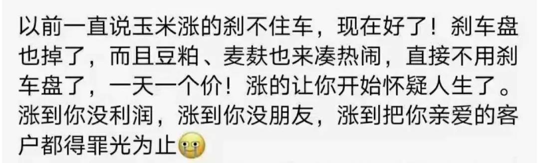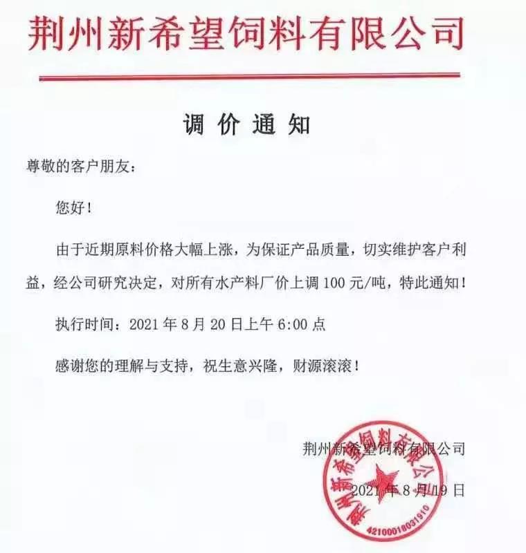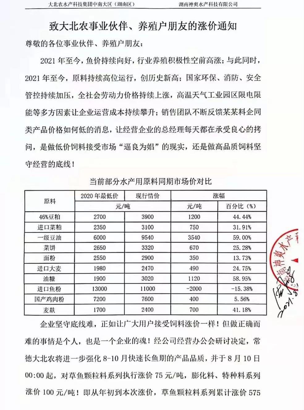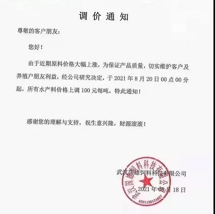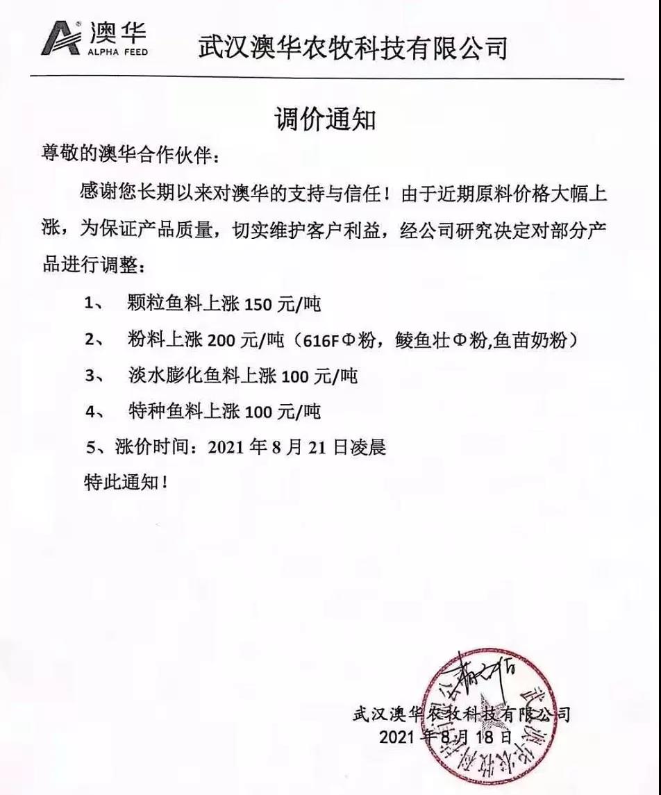 文/ 水產前沿 華東、華中水產料又全線暴漲 水產前沿網原創報道,飼料持續瘋漲中,新一輪漲價潮在兩大區爆發,一個是華東地區,華東是全國第二大投料量地區,超360萬噸,其中江蘇飼料容量約260萬噸,浙江、安徽約50多萬噸。另一個是華中地區,全國第三大投料量地區,市場容易超250萬噸,其中湖北約160萬噸,湖南約90萬噸。毫無疑問,兩地當屬飼料企業必爭之地,料價上漲自然引發行業高度關注。 華中湖北湖南上漲普水料、特水料:海大、正大、新希望、粵海、澳華、大北農、匯海、家泰最高漲300元/噸 8月19、20日,華中湖北、湖南兩地又突發一輪飼料爆漲潮,多料企同步發布漲價通知,有海大、正大、新希望、粵海、澳華、大北農、匯海、家泰共13個漲價信息,漲價時間在8月20日、21日和24日,漲價的品種有普水顆粒魚料,漲幅在100-150元/噸,膨化料(含特種料)漲幅在100-300元/噸。 華東江蘇:海大、通威、天邦上漲對蝦料、魚料,最高漲300元/噸 在華東地區,海大、通威、天邦、大江、天成等對蝦料、蝦蟹料、普水料、特種料全線大漲,據了解是整個大華東都漲,其中部分料企是內部通知、口頭通知,部分料企正式發布漲價通知。據知情人士稱,華東飼料市場較復雜,近2-3年來很少正式發布通知,多為內部通知、口頭通知。 蝦料方面:正式發布漲價通知的企業有無錫通威、南通巴大。漲價品種有普通蝦料漲200元/噸、蝦肝強(高端料)漲300元/噸、蝦蟹料漲150元/噸,漲價時間在8月18日、19日,與8月15日海大漲價的幅度幾乎一致(對蝦普通料上漲200元/噸、高端料上漲300元/噸,蝦蟹料上漲150元/噸)。 魚料方面:海大華東大區8月15日統一上漲顆粒料100元/噸、膨化料150元/噸。8月份揚州通威上調黃顙魚料200元/噸、泥鰍料300元/噸、蝦蟹料150元/噸。天邦膨化料漲200元/噸、顆粒料漲100元/噸。 另據了解,連云港、淮安通威8月初宣布漲100元/噸,8月10號前后全部執行到位。大江飼料和天成飼料年初漲價350元/噸,8月份宣布了100元/噸,跟去年8月比漲幅都是450元/噸。 8月20日,豆粕最高漲到3790元/噸,破6個月高位 據飼料行業信息網相關統計數據顯示,8月16日國內主流油廠豆粕成交均價為3761元/噸,,主流市場豆粕價格再漲到3780元/噸新高度,這是8月份來的最高價,同時比2020年8月17日最高價2950元/噸的同期比高出了830元/噸。突破了接近6個月以來的高位。農業農村部數據顯示,生豬等存欄仍在持續復蘇,加之氣溫下降,國慶中秋隨之到來等因素也將提振養殖端對豆粕需求。此外,南美大豆出口接近尾聲,未來對美豆的需求較為強勁,因疫情原因導致港口卸貨緩慢,油廠庫存不斷下降,國家糧油信息中心相關數據顯示截止8月16日,國內主要油廠豆粕庫存 83 萬噸,較上周同期繼續減少8萬噸。8月15日大豆周度生長報告顯示美國大豆生長優良率下降至57%,較上一周下降3%,低于市場預期的60%以及去年同期的72%,CBOT受此支撐繼續出現上漲,國內豆粕受此影響易漲難跌。 8月20日,飼料聯盟信息平臺原料價格統計顯示,46豆粕均價為3790元/噸。 來自:飼料聯盟信息平臺 附:8月20-24日華中地區漲價料企 天門海大飼料(普水料)漲價通知 天門海大飼料(特水料)漲價通知 武漢正大飼料漲價通知 仙桃六和飼料漲價通知 湖北團風新希望飼料漲價通知 荊州新希望飼料漲價通知 武漢國雄飼料漲價通知 武漢澳華飼料漲價通知 天門粵海飼料漲價通知 武漢大北農飼料漲價通知 湖南神爽飼料漲價通知 湖北匯海飼料漲價通知 荊州家泰飼料漲價通知 附8月18-29日華東地區漲價通知 無錫通威飼料漲價通知 南通巴大飼料漲價通知 鹽城天邦飼料漲價通知 原料漲到剎不住車,剎車盤也掉了! 最近,飼料人的朋友圈又流行這樣的說法:以前一直說玉米漲的剎不住車,現在好了!剎車盤也掉了,而且豆粕、麥麩也來湊熱鬧,直接不用剎車盤了,一天一個價!漲的讓你開始懷疑人生了。漲到你沒利潤,漲到你沒朋友,漲到把你親愛的客戶都得罪光為止。各位老板請理解,人都是正經人,飼料也是正經飼料,只是行情不太正經,原料市場太瘋狂,飼料廠是被逼無奈! |