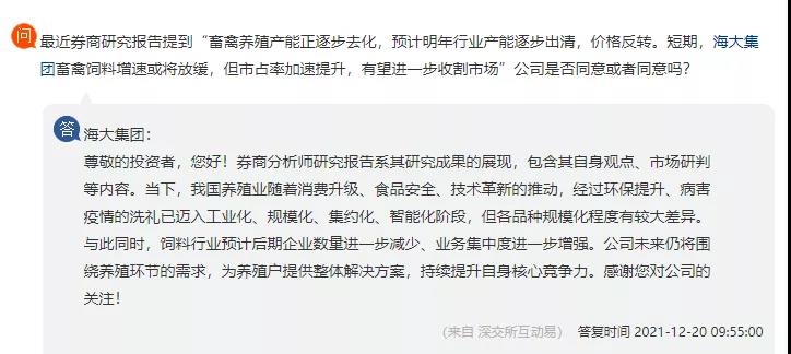 文/ 水產前沿 獨家整理 水產前沿網整理報道,12月24日,海大集團、天馬科技相繼沖高,領漲農林牧飼!截止12月24日下午3時,農林牧飼版塊漲幅前三分別為新賽股份、天馬科技、海大集團,其中新賽股份主業為棉花加工。 數據來源:東方財富網 海大白馬龍頭股,核心競爭力凸顯,成長性強 截止12月24日下午3時,海大集團以74.65元收盤,日漲幅達5.04%,市值1240億。值得注意的是,進入12月以來,海大股價就不斷沖高上漲,彰顯出了資本市場對海大集團穩定增長的充足信心! 數據來源:東方財富網 天風證券研究所曾公開發布研究報告,將海大集團列為農業牛股十大金股之一。其中分析道:養殖農資(飼料為主)行業長期需求可持續、剛性、空間足夠大。海大集團專注農資賽道,構建強核心競爭力。海大集團的成長空間,包括水產料行業空間擴容和增長,海大由于核心競爭力帶來的市占率不斷提升。中長期來看,公司再畜禽養殖規模化進程中,實現大客戶高速增長+經銷渠道客戶穩定增長;水產料在多年綜合服務商的打造下,已形成飼料+動保+種苗+金融一體的強粘性模式,進入壁壘高,各業務正反饋機制強化;市占率加速提升;主業盈利能力有望進一步提升。考慮到今年豬價暴跌影響和疫情反復影響,預期2021年海大集團實現收入843.37億元,同增39.81%,長期飼料龍頭地位仍然穩固。 實際上關于核心競爭力,海大集團董秘也有相關回復稱:當下,我國養殖業隨著消費升級、食品安全、技術革新的推動,經過環保提升、病害疫情的洗禮已邁入工業化、規模化、集約化、智能化階段,但各品種規模化程度有較大差異。與此同時,飼料行業預計后期企業數量進一步減少、業務集中度進一步增強。公司未來仍將圍繞養殖環節的需求,為養殖戶提供整體解決方案,持續提升自身核心競爭力。 那這是否意味著,在工業化養殖的未來,飼料將是海大集團布局產業鏈的基礎,實際上會有更多擴展呢? 天馬20億元的大項目,已然有譜 截止12月24日下午3時,天馬科技以12.64元收盤,日漲幅達7.48%,市值55.13億。其實,進入12月以來,天馬可以已經收獲數個漲停,多個連漲,從7.60元到12.78元,漲幅達到了68%! 數據來源:東方財富網 這不僅僅是因為天馬科技正朝著融特種水產、畜牧、食品和一二三產業融合發展的大型現代漁牧集團化企業目標穩步邁進,還應該與天馬科技將新建特種水產全產業鏈供應鏈平臺等大項目有關。實際上,天馬科技董秘也有公開回復稱公司擬與香港天馬共同設立子公司,并將作為在武寧縣投資創建特種水產全產業鏈供應鏈平臺和綠色生態食品供應鏈平臺等建設項目的實施主體。 天馬科技曾與武寧縣人民政府于2021年12月2日在江西省武寧縣以書面的方式簽署了《投資合作框架協議》。協議顯示天馬科技將在武寧縣投資創建特種水產全產業鏈供應鏈平臺和綠色生態食品供應鏈平臺,主要包含特種水產種苗繁育基地、特種水產工廠化設施農業產業基地、特種水產飼料加工廠、特種水產食品加工廠、鰻鱺文化產業園、鰻魚小鎮、區域總部和特種水產研究院等項目,項目集研發、生產、銷售、科普、休閑文旅及進出口等業務為一體,項目將根據市場情況分期分段實施,項目投資總額預計為20億元。土地使用總面積約為3200畝,其中設施農業用地約為3000畝,工業用地約為200畝。 20億元的大項目,已然有譜! |