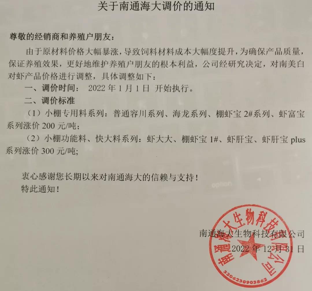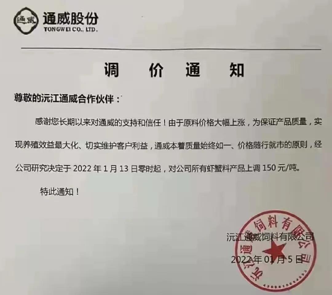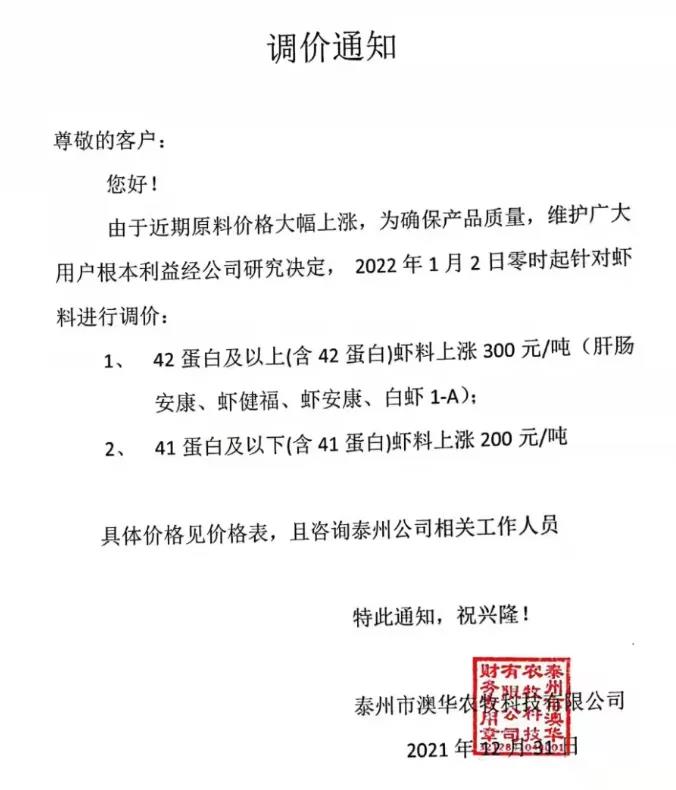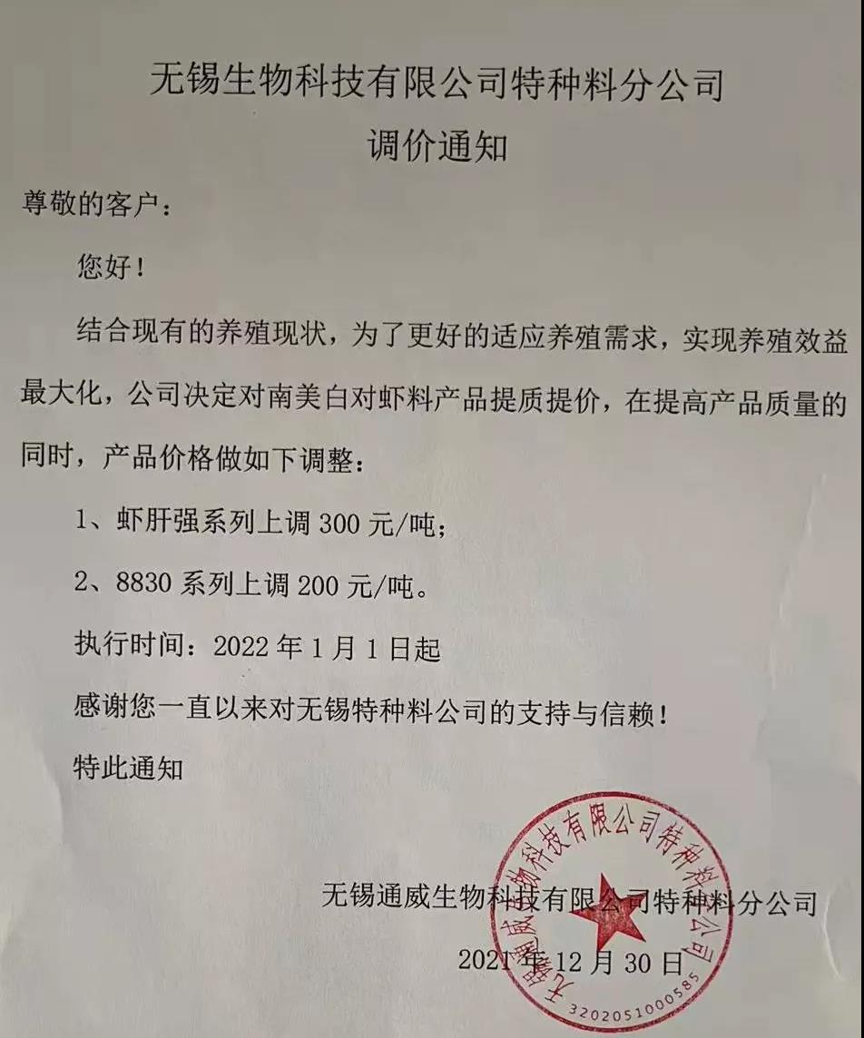 文/ 水產(chǎn)前沿 水產(chǎn)前沿網(wǎng)原創(chuàng)整理報道,進(jìn)入2022年新年,華東、華中地區(qū)蝦蟹飼料迎來大面積漲價,包括海大、通威、澳華、天馬等多個飼料集團(tuán)巨頭子公司宣布漲價,漲幅在200-300元/噸。 現(xiàn)階段正值節(jié)前備貨高峰,飼料原料價格持續(xù)上漲,1月10日豆粕成交價格為3613.04元/噸,漲至10月底以來的高位。 受原料大漲影響,昨日,珠海海龍、順德旺海、順德鼎一、佛山金浦等多家飼料企業(yè)發(fā)布漲價通知,加州鱸料上調(diào)200元(約4元/包),華南飼料漲價潮正式打響。 肇慶高要海大生物科技有限公司漲價通知 漲價通知 尊敬的各位經(jīng)銷商、養(yǎng)殖戶朋友: 您們好!感謝您對我司一直以來的鼎力支持,由于原材料價格持續(xù)高位運行,為了確保產(chǎn)品質(zhì)量,實現(xiàn)養(yǎng)殖效益最大化,經(jīng)公司研究決定,定于2022年1月15日零點起,對產(chǎn)品價格作如下調(diào)整: 加州鱸料全系列漲價200元/噸(含鱸生元),即4元/包。 我們將一如既往為您提供優(yōu)質(zhì)產(chǎn)品與服務(wù)! 肇慶高要海大生物科技有限公司 2022年1月15日 珠海海龍生物科技有限公司漲價通知 順德旺海飼料實業(yè)有限公司漲價通知 調(diào)價通知 尊敬的客戶: 您好!感謝您對我公司的關(guān)心與支持!由于近期原材料價格持續(xù)大幅上漲,為保證產(chǎn)品質(zhì)量,經(jīng)公司研究決定:從2022年1月15日0:00起,對公司部分產(chǎn)品價格進(jìn)行調(diào)整: 1、普通加州料、精品加州料、賽冰鮮加州料系列每噸上調(diào)200元(4元/包); 2、其他品種暫不調(diào)價。 特此通知! 順德旺海飼料實業(yè)有限公司 2022.1.14 廣東順德鼎一生物科技有限公司漲價通知 調(diào)價通知 尊敬的客戶: 您好!感謝您對我公司的關(guān)心與支持!由于近期原材料價格持續(xù)大幅上漲,為保證產(chǎn)品質(zhì)量,經(jīng)公司研究決定:從2022年1月15日0:00起,對公司部分產(chǎn)品價格進(jìn)行調(diào)整: 1、加州料系列每噸上調(diào)200元(4元/包); 2、其他品種暫不調(diào)價。 特此通知! 廣東順德鼎一生物科技有限公司 2022.1.14 佛山市金浦飼料實業(yè)有限公司漲價通知 升價通知 尊敬的各位經(jīng)銷商和養(yǎng)殖戶朋友: 您們好!由于原料價格大幅度上漲,在確保產(chǎn)品質(zhì)量的前提下對以下品種進(jìn)行價格調(diào)整,具體調(diào)整如下: 一、調(diào)整時間:2022年1月15日中午12:00。 二、調(diào)整品種及調(diào)整幅度: 1、加州鱸料上漲200元/噸(即10kg/包升2元/包、20kg/包升4元/包) 2、其它品種價格保持不變; 特此通知!恭祝商祺! 佛山市金浦飼料實業(yè)有限公司 2022年1月15日 廣東東騰飼料有限公司漲價通知 更多漲價、備貨通知 華中地區(qū)料企漲價通知 ↓↓↓ 華東地區(qū)料企漲價通知 ↓↓↓ 備貨通知 ↓↓↓ |