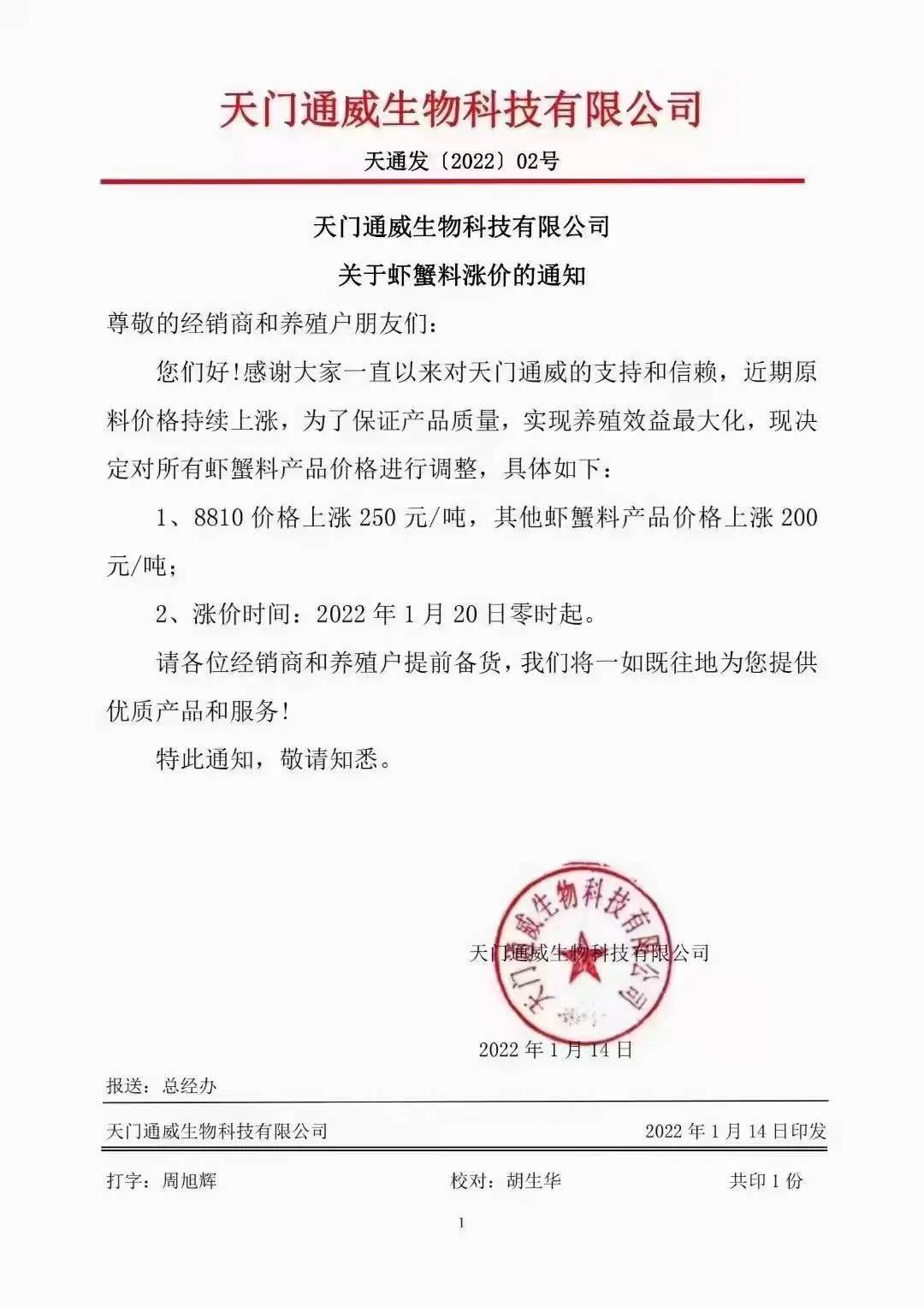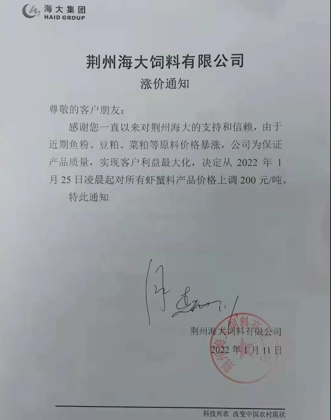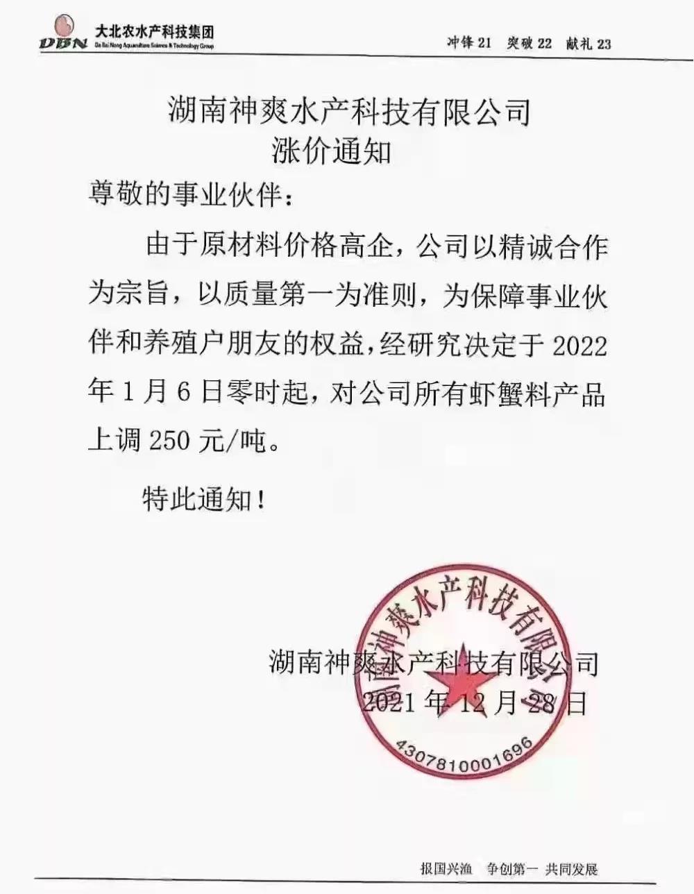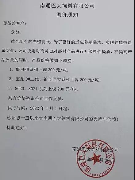文/ 水產(chǎn)前沿 水產(chǎn)前沿網(wǎng)原創(chuàng)整理報道,進(jìn)入2022年新年,華東、華中地區(qū)蝦蟹飼料迎來大面積漲價,包括海大、通威、澳華、天馬等多個飼料集團(tuán)巨頭子公司宣布漲價,漲幅在200-300元/噸。 現(xiàn)階段正值節(jié)前備貨高峰,飼料原料價格持續(xù)上漲,1月10日豆粕成交價格為3613.04元/噸,漲至10月底以來的高位。 受原料大漲影響,昨日,珠海海龍、順德旺海、順德鼎一、佛山金浦等多家飼料企業(yè)發(fā)布漲價通知,加州鱸料上調(diào)200元(約4元/包),華南飼料漲價潮正式打響。 肇慶高要海大生物科技有限公司漲價通知 漲價通知 尊敬的各位經(jīng)銷商、養(yǎng)殖戶朋友: 您們好!感謝您對我司一直以來的鼎力支持,由于原材料價格持續(xù)高位運行,為了確保產(chǎn)品質(zhì)量,實現(xiàn)養(yǎng)殖效益最大化,經(jīng)公司研究決定,定于2022年1月15日零點起,對產(chǎn)品價格作如下調(diào)整: 加州鱸料全系列漲價200元/噸(含鱸生元),即4元/包。 我們將一如既往為您提供優(yōu)質(zhì)產(chǎn)品與服務(wù)! 肇慶高要海大生物科技有限公司 2022年1月15日 珠海海龍生物科技有限公司漲價通知 順德旺海飼料實業(yè)有限公司漲價通知 調(diào)價通知 尊敬的客戶: 您好!感謝您對我公司的關(guān)心與支持!由于近期原材料價格持續(xù)大幅上漲,為保證產(chǎn)品質(zhì)量,經(jīng)公司研究決定:從2022年1月15日0:00起,對公司部分產(chǎn)品價格進(jìn)行調(diào)整: 1、普通加州料、精品加州料、賽冰鮮加州料系列每噸上調(diào)200元(4元/包); 2、其他品種暫不調(diào)價。 特此通知! 順德旺海飼料實業(yè)有限公司 2022.1.14 廣東順德鼎一生物科技有限公司漲價通知 調(diào)價通知 尊敬的客戶: 您好!感謝您對我公司的關(guān)心與支持!由于近期原材料價格持續(xù)大幅上漲,為保證產(chǎn)品質(zhì)量,經(jīng)公司研究決定:從2022年1月15日0:00起,對公司部分產(chǎn)品價格進(jìn)行調(diào)整: 1、加州料系列每噸上調(diào)200元(4元/包); 2、其他品種暫不調(diào)價。 特此通知! 廣東順德鼎一生物科技有限公司 2022.1.14 佛山市金浦飼料實業(yè)有限公司漲價通知 升價通知 尊敬的各位經(jīng)銷商和養(yǎng)殖戶朋友: 您們好!由于原料價格大幅度上漲,在確保產(chǎn)品質(zhì)量的前提下對以下品種進(jìn)行價格調(diào)整,具體調(diào)整如下: 一、調(diào)整時間:2022年1月15日中午12:00。 二、調(diào)整品種及調(diào)整幅度: 1、加州鱸料上漲200元/噸(即10kg/包升2元/包、20kg/包升4元/包) 2、其它品種價格保持不變; 特此通知!恭祝商祺! 佛山市金浦飼料實業(yè)有限公司 2022年1月15日 廣東東騰飼料有限公司漲價通知 更多漲價、備貨通知 華中地區(qū)料企漲價通知 ↓↓↓ 華東地區(qū)料企漲價通知 ↓↓↓ 備貨通知 ↓↓↓ |
