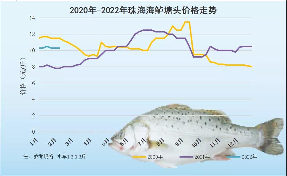 文/圖 水產前沿 陳曉慶 價格走勢 水產前沿網原創報道,春節假期,水產市場迎來了消費旺季。各式水產品日漸成為年夜飯和春節宴客的標配。鱖魚、生魚、加州鱸、對蝦、石斑魚等多種魚蝦價格都迎來了上漲。今天是大年初五迎財神,海鱸魚也有望將迎來漲價。 本周珠海海鱸水車1.2-1.3斤規格報價10.3-10.4元/斤,1.3-1.4斤規格報價10.2元/斤,價格與上周持平。冰車暫停運輸,當地加工廠也還未開始收魚,偏大魚無人捉,暫無報價。業內人士表示,去年由于疫情的原因,很多工人一年只能回去一次,今年商家備貨也比較充足,所以休息時間相比去年要長一些。明后天冰車也將陸陸續續開工,加工廠方面要等到初七、初八才開始收魚。 目前這批商品魚由于去年只下了3億多的苗,現在整體存塘量不是很多,1斤4到1斤8規格的海鱸比較缺乏,過幾天冰車和加工廠陸續開工,收儲量將大大增加,市場價格有望迎來上漲,有水車老板表示,水車價格近期將有3毛左右的漲幅。 2月5日塘頭報價