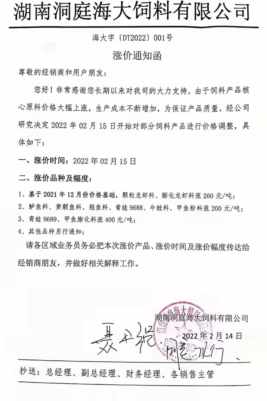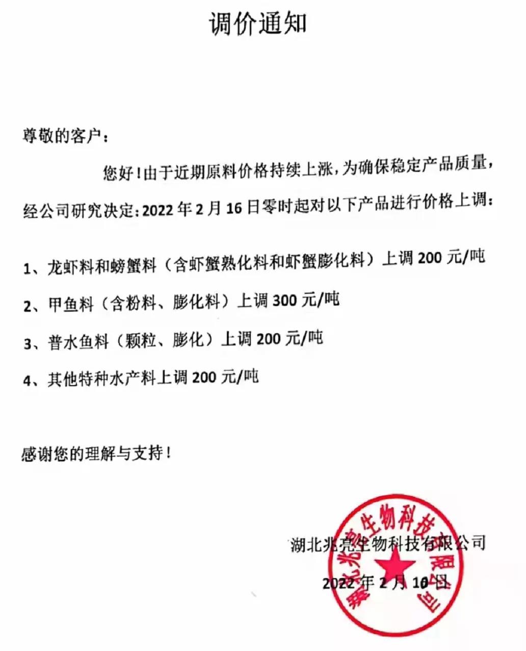 暴漲500元/噸!華中今天飼料大漲價(jià)! 水產(chǎn)前沿網(wǎng)原創(chuàng)報(bào)道,毫無意外,繼華南、西南飼料急急上漲后,華中市場水產(chǎn)料頂不住又暴漲了! 這是進(jìn)入2022年后第二輪大漲價(jià)。今年華中地區(qū)第一輪漲價(jià)是從1月6日起直至1月25日,長達(dá)20天時(shí)間里,海大、通威、新希望、大北農(nóng)、澳華、湘大等飼料巨頭多個(gè)子公司均漲價(jià),當(dāng)時(shí)漲價(jià)主要品種為蝦蟹料,漲幅為200元/噸。 本輪華中地區(qū)宣布漲價(jià)的企業(yè)有海大、湘大、兆亮等,漲價(jià)的品種普通魚料、高檔特種魚料(黃顙、鱸魚、泥鰍、黃鱔、青蛙、牛蛙、甲魚等),漲幅在200-500元/噸,漲價(jià)也十分驚人。此外,本輪華中市場蝦蟹料又一次漲價(jià),就是說,2022年華中蝦蟹料已是第二次漲價(jià),漲價(jià)幅度在200-260元/噸,兩輪相加最高漲幅達(dá)到了460元/噸。 華南、西南持續(xù)漲不停,更多料企漲漲漲 飼料價(jià)格在各大養(yǎng)殖戰(zhàn)區(qū)全線猛漲,連日來,華南地區(qū)更多料企加入漲價(jià)大軍。2月14日,廣東粵佳宣傳今天漲價(jià),羅蝦料、混養(yǎng)混各漲200元/噸。 西南地區(qū)的云南市場,海大、通威、新希望均在今天起大漲,最高漲400元/噸。 華東即將大漲 據(jù)水產(chǎn)前沿對飼料頭部企業(yè)華東大區(qū)負(fù)責(zé)人了解,在原料暴漲壓力下,目前大家正在商量漲價(jià)計(jì)劃,據(jù)透露,華東市場或在2月20日左右漲價(jià),最遲不超過2月底。 提醒經(jīng)銷商、養(yǎng)殖戶真的要抓緊時(shí)間備貨了。 附:虎年華中地區(qū)水產(chǎn)料漲價(jià)消息 天門海大飼料有限公司漲價(jià)通知 洞庭海大飼料有限公司漲價(jià)通知 湖北湘大水產(chǎn)科技有限公司漲價(jià)通知 湖北兆亮科技有限公司漲價(jià)通知 |