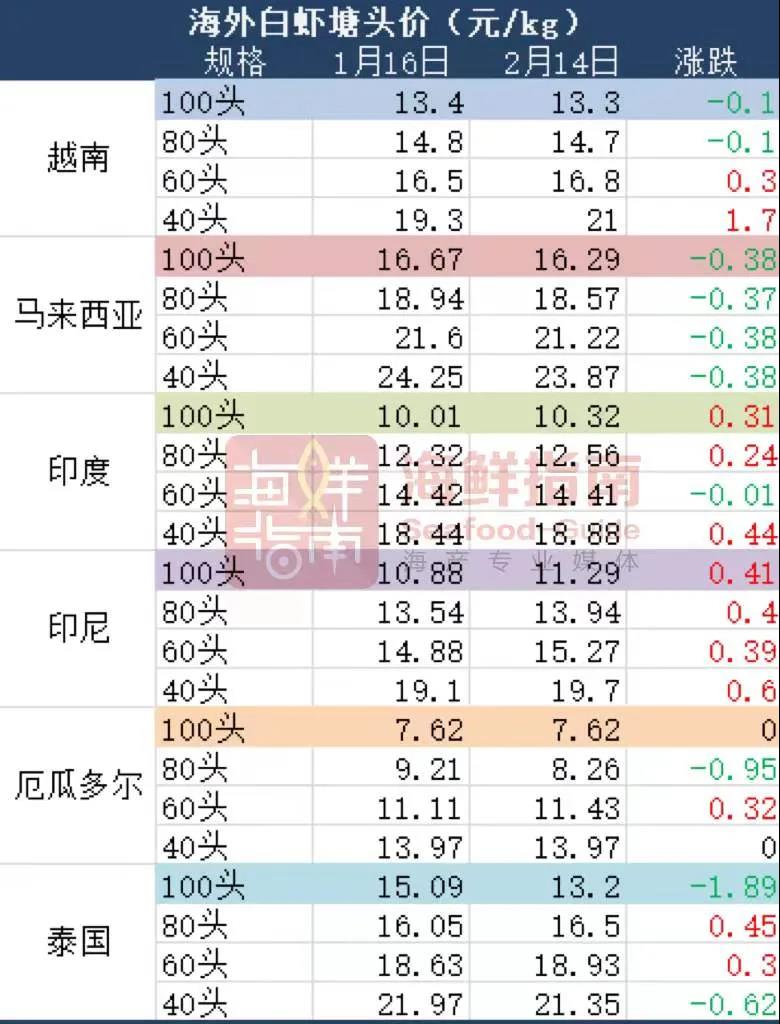 文/ 海鮮指南(seafood-guide)曾鈴程 水產前沿網原創報道,上周,海鮮指南收到厄瓜多爾白蝦廠商最新報價: 30/40 $6.51 40/50 $6.21 50/60 $5.91 60/70 $5.51 (鹽凍+0.1~0.2$,報價僅供參考,以工廠實際為準) 相比春節前,期貨中小規格白蝦都在漲,漲幅0.1~0.2$/kg左右。一般年后是淡季,然而去年底國內卻大量下單進口白蝦,據厄瓜多爾水產養殖商會(CNA)數據,在2021年11-12月期間,厄瓜多爾出口至中國白蝦超過了9萬噸,約合5000多柜(以18噸/柜估計)!業內人士介紹,這批貨應該就是近段時間到港,但是因為航運情況不穩定,所以有的是在清關、有的已經到了,不太統一。 對此,全聯集采水產品(廣東)股份有限公司運營總監潘泓宇告訴海鮮指南:“首先是因為降關稅,大家多買一點,擔心后面漲價;其次,印度蝦等漲價,厄瓜多爾相對價格低;其三,就是疫情減緩,大家有了一些信心。” 厄瓜多爾白蝦產品貨柜數(按每柜約18噸白蝦凈重計算所得,以實際為準) 相對于廠商價,海外蝦塘頭價變動也比較大。白蝦,印度、印尼全線上漲;越南規格蝦大幅度上漲,40只蝦漲幅達1.7元/kg;厄瓜多爾60只蝦上漲0.32元/kg,80只蝦下跌0.95元/kg。黑虎蝦方面,越南、馬來西亞全線上漲,最高幅度達到了5.5元/kg! 2月14日海外各對蝦主產國出塘價 |