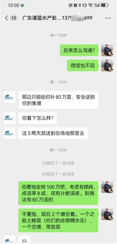 | 水產前沿網獨家報道, 最近幾個月以來,在廣州南沙從事魚苗培育養殖的蘇增金真的是比較煩、很煩很撓心! 事情起因是這樣的,據蘇增金告訴筆者,今年5月29日,他通過惠州市湛藍水產發展有限公司總經理彭斌,從廣西欽州一家淡水魚水花魚苗場購買了500萬尾的赤眼鱒水花,37元/萬,金額1.85萬元。當時的水花如頭花絲般大小,規格在幾十萬尾/斤。及養殖一個多月,規格達到200尾/斤時,才發現這魚苗根本不是赤眼鱒魚苗,而是普通得不能再普通的土鯪魚苗(一般喂鱖魚的餌料魚),于是通過彭斌向水花場提出疑問,經過辨認和確認,彭斌和魚苗場承認是發錯苗了。 赤眼鱒 土鯪 經過一番交涉,在7月14日,魚苗場通過彭斌表示,答應重新賠償80萬尾規格為1000尾/斤赤眼鱒魚苗。7月23日,蘇增金從其他魚塘清理出一個魚塘出來,可以在7月31日補苗,彭斌推遲到8月5日裝貨,8月6日送到。據蘇增金表示,他當時不敢清理土鯪魚苗養殖塘,因為要保留證據不輕易處理掉,迫不得已只好清空另外一口塘來培育賠償的赤眼鱒魚苗。 但是這一次,水花場又食言了。 8月6日,白白空等了一天,打了無數個電話,也迎不來魚苗運輸車。 剩下來的時間了,又經過多次溝通交涉,水花場以各種借口推諉就是不補苗,最后一次答應,8月7日補苗。彭斌說8月7日晚上10點從欽州出發,8月8日早上到達蘇增金魚塘。但蘇增金無奈告訴筆者,真是心力交瘁:8月7日蘇總一直在與彭斌溝通刮魚吊水及車輛情況,彭斌于8月7日19點05分說,魚已經刮起來了,在魚池吊水。結果又等了一個空。在忍無可忍之下,8月8日,蘇增金以被詐騙的原由終于報警。 蘇增金與彭斌微信溝通賠苗事宜 據蘇增金告訴筆者,很多淡水魚苗水花,僅頭發絲那么大,還沒有長出鱗片,很難辨別是到底是哪種魚,如草魚、大頭、鰱魚、鯪魚、赤眼鱒等;另外赤眼鱒,又稱紅眼鯪,與土鯪魚很相似;他購買的這批赤眼鱒水花當時只有出殼5-6天左右,即使專業人士憑肉眼也無法辨別其真偽。 從5月29日養殖到現在,已經過去了80多天,在2個多月時間里,投入了塘租、人工、飼料、動保、電費等投入品,最主要是浪費了時間和專業技術成本及品種價格差異。 據了解,近年來赤眼鱒魚苗在市場供不應求。5月份,赤眼鱒水花在30-40元/萬,土鯪魚水花僅3-4元/萬。在6月至7月初,2000尾/斤赤眼鱒魚苗曾一度賣到0.2元/尾,相當于400元/斤,而同規格土鯪苗一般也就5-6元/斤,價格相差近80倍。即使赤眼鱒規格達到150尾/斤,在珠三角按25-30元/斤算,目前有12000斤魚苗,能賣將近有30萬元左右,但是土鯪苗僅能賣區區幾萬元,相當于損失了20多萬。 據蘇增金告訴筆者,他和欽州水花場并不認識,沒有對方任何聯系方式,購買水花的一切事宜都是通過彭斌這位中介朋友進行,他和彭斌是老相識,認識有10年之久,也多次從彭斌那里購買魚苗。這次購買魚苗及提出賠償等,同樣是與彭斌單線聯系,彭斌沒有透露出欽州魚苗場任何信息。 據筆者與彭斌聯系知悉,彭斌對蘇增金情況也很了解,也證實蘇增金購買的的確是土鯪水花,但彭斌告訴筆者,他不會為此事承擔負責,因為他所得到傭金很微利,但可以協助蘇增金向水花場要求合理地賠償損失。 彭斌還告訴筆者,與蘇增金一起購買赤眼鱒水花另外還有兩個養殖戶,但那兩家人在培育過程中,水花成活率太低,根本沒有機會來鑒別后來的魚苗是赤眼鱒或者是土鯪,只有蘇增金是專業人士,繁育技術比較好才孵化出魚苗,也才有了后面的故事。 彭斌表示,由于今年赤眼鱒水花需求量大,市場供不應求,不排除苗場詐騙造假訛人,所以他找過水花場質問過,對方解釋是工人開錯了水花管道,把土鯪當赤眼鱒賣了,并答應釋數進行賠償。 在欽州從事赤眼鱒魚苗培育的陳老板說,今年5月份,廣西欽州發大水,很多蝦塘被沖走。陳老板自己的赤眼鱒魚苗繁殖場,親魚也被沖走,而導致繁殖不了。赤眼鱒最適宜的繁殖溫度是28℃,今年5月底、6月初,欽州水溫大概25℃,不夠理想;當時親魚性腺發育不成熟,100條親魚,很難挑出10條性腺發育成熟的,導致催產親魚成數很低,很多親魚在打催產針后死亡;原本計劃出1000萬赤眼鱒水花,結果只能產出200-300萬赤眼鱒水花。 在佛山從事赤眼鱒魚苗標粗的大榮說,在5月底、6月初,基本很難從欽州購買出赤眼鱒水花,基本繁育不出來。 彭斌繼續告訴筆者,他從2010年起就從事目前的中介工作,已有14年從業經歷,過中也經常遇到各種水花如草魚鰱魚大頭混在一起,這個現象通常是管道有時關閉不緊,或時有開錯造成,但一般混進其他品種水花數量極少,仍是主要品種為主,而像蘇增金的遭遇可以說是第一次遇到,全部是土鯪沒有赤眼鱒。 據了解目前除了蘇增金報警外,彭斌也表示他也會報警。 購買魚苗18500元 問題來了! 作為專業人士的蘇增金,買水花為何不是親自到場看過后再買?他這樣對筆者解釋,因為購買的數量貨值不多,親自購買成本高、運費貴;且彭斌也是認識10年的朋友了,信得過。蘇增金也向欽州幾個苗種場詢問赤眼鱒水花,幾個苗場都說打不出赤眼鱒魚苗來,沒有水花;當時只有彭斌說有赤眼鱒水花,哪里知道對方會用土鯪魚水花冒充赤眼鱒水花。今年水產養殖行業處境十分艱難,而自己損失近30萬,沒想到讓自己遇到這么煩心的事。他表示一是將繼續追究相關單位人員責任,以維護自己合法權益,二是想通過水產前沿平臺,提醒大家注意凈化養殖空間,警惕造假養殖場