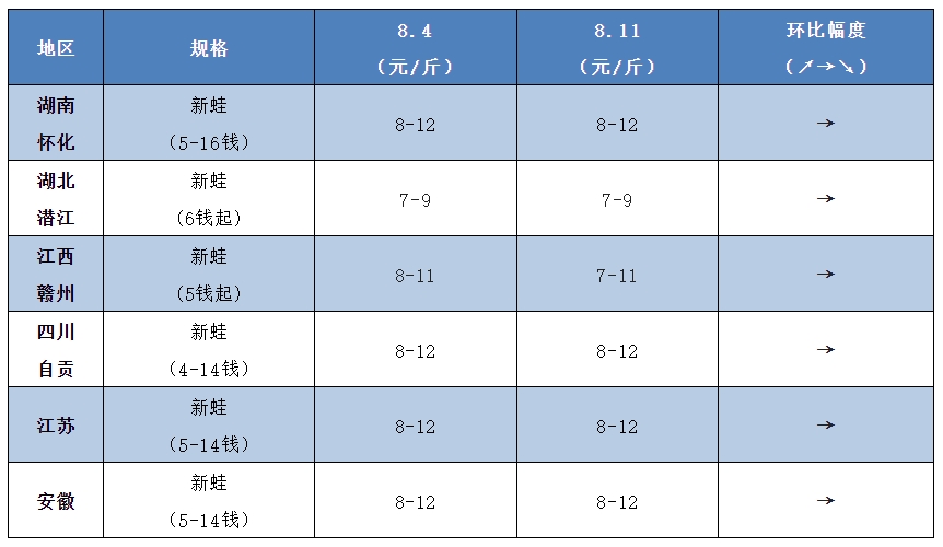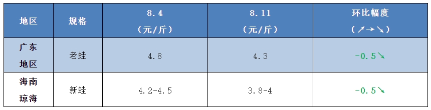 | 水產前沿網原創報道, 牛蛙行情 明日牛蛙主流廠家報價5.2-6.5元/斤,相比上周同期下調了0.3-0.6元/斤。 目前暑期已經過半,但牛蛙行情卻不如大家的預期,多次不漲反跌。據了解,目前多地新蛙已經上市,規格普遍在3-6兩、3-7兩以上,而華中湖南、江西等地過冬蛙存塘量仍然還是很大,像江西地區預計至少還要二十多天才能出完。牛蛙存塘量大,所以七夕一過牛蛙又再次迎來了跌價。 蝌蚪苗方面,由于行情低迷投苗需求量少,加上當前季節生產成本較高,8-9月份大部分苗場暫時停產,而小四腳也因為養殖戶的整體養殖信心較弱,行情也持續低迷,目前50-60頭規格的小四腳報價為15-18元/斤。 泰蛙行情 泰蛙方面,上周蛙價回升0.5-0.6元/斤,但好景不長,本周蛙價再次回落0.5元/斤,目前泰蛙新蛙持續上市,加上牛蛙跌價的沖擊,業內人士預計價格還會繼續回落。 黑斑蛙行情 黑斑蛙方面,現在新蛙的規格逐漸起來,而且具有價格優勢,像江浙滬等地方也開始選擇用老蛙代替新蛙,很多流通商也停止收老蛙。行情方面,新蛙報價基本穩定在8-12元/斤左右,除非部分場地出現病蛙才會被壓價。 目前價格再低養殖戶也面臨虧本不愿意出,另外因為越來越多新蛙達到上市規格,價格也很難再漲回去,只能靜待十月之后氣溫降低蛙價預計才會逐漸回暖。 (溫馨提示:本文的價格數據和行情分析及觀點僅供大家學習和參考,不構成投資和交易建議。) |