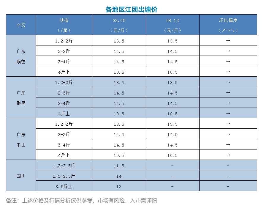 | 水產(chǎn)前沿網(wǎng)報道, 桂花魚:低迷再跌4-5元/斤! 本周佛山鱖魚繼續(xù)有跌4-5元/斤,外省同步下跌2-5元/斤不等。佛山鱖正值新舊魚交替,出魚相對集中,加上消費市場疲軟,行情下滑。外省鱖魚塘頭交易量稍少,行情隨市下跌,兩湖地區(qū)受廣東低價魚沖擊影響,魚價也同步下行。 廣東佛山:今日3成中鱖塘口價34元/斤,2成中鱖塘口價34元/斤,1成中1成小鱖塘口價33元/斤,2成小鱖塘口價32.5元/斤,3成小鱖塘口價32元/斤,魚價較上周同期下跌4-5元/斤左右,具體成交價以實際為準(zhǔn)。據(jù)了解,目前正值新舊魚交替時段,塘頭出魚相對集中,然而市場消費疲軟,受供需關(guān)系影響,魚價下行。“現(xiàn)在老魚還抓不過來,新魚又有得出了,市場基本不缺魚。”佛山流通嘆道!敖谛星楣烙嫸茧y,新魚陸續(xù)上市,養(yǎng)戶擔(dān)心老口后面更難出,且后續(xù)高溫、臺風(fēng)等極端天氣也增加了風(fēng)險,出魚意愿較強,但終端消費疲乏,供過于求了魚價也難漲。”佛山業(yè)者補充道。另外,據(jù)中央氣象臺了解,8月12日到14日,華北、黃淮和西南地區(qū)東部、江南、華南等地降雨持續(xù),部分地區(qū)雨勢較強,各養(yǎng)戶朋友還需做好塘頭預(yù)防管理。 廣西:近日廣西南寧標(biāo)鱖40元/斤,塘頭交易量不多,基本有價無市。 江西:上饒標(biāo)鱖40元/斤,隨市下跌2元/斤。 江蘇:近日高郵標(biāo)鱖40元/斤左右,當(dāng)?shù)卮嫣僚f魚已較少,加上高溫出魚損耗大,塘頭交易量不多。 兩湖:近日兩湖地區(qū)標(biāo)鱖受廣東低價魚沖擊影響,魚價下滑,部分流通暫停開魚。 安徽:近日規(guī)格最好的純標(biāo)飼料鱖38元/斤左右,偏大的統(tǒng)貨魚35元/斤,魚價較上周下跌3-5元/斤不等。市場銷量不佳,塘頭開魚減量。 加州鱸:缺魚最高再漲1元/斤 本周廣東反季節(jié)魚陸續(xù)上市,養(yǎng)戶出魚積極性較高,但市場消費一般,魚價暫保持穩(wěn)定。外省大魚存塘告急,魚價穩(wěn)中上行。另外據(jù)貴陽船牌飼料公司人士反饋,本周貴州鱸魚塘邊價19-20.5(規(guī)格0.8-1.5斤/尾),當(dāng)?shù)卮嫣留~不足3成,塘頭企穩(wěn)高價。 生魚:大魚再漲0.3-0.4元/斤! 本周廣東生魚大魚繼續(xù)有漲0.3-0.4元/斤,中魚保持穩(wěn)定。據(jù)了解,大魚上漲主要高溫天刮魚多硬骨,塘頭放網(wǎng)增加,養(yǎng)戶出魚意愿一般。中魚方面加工廠收魚積極性一般。 黃顙魚:高價企穩(wěn) 本周黃顙魚市場缺大魚的情況仍然存在,魚價繼續(xù)高位運行。 江團:保持穩(wěn)定 本周廣東江團魚價繼續(xù)持穩(wěn),業(yè)者仍看好后市行情。 雜交鱘:消費疲軟跌0.5元/斤 鱘魚3-6斤規(guī)格的鱘魚塘邊價13.5-14.5元/斤,市場消費疲軟,魚價較上周稍跌0.5元/斤。 |