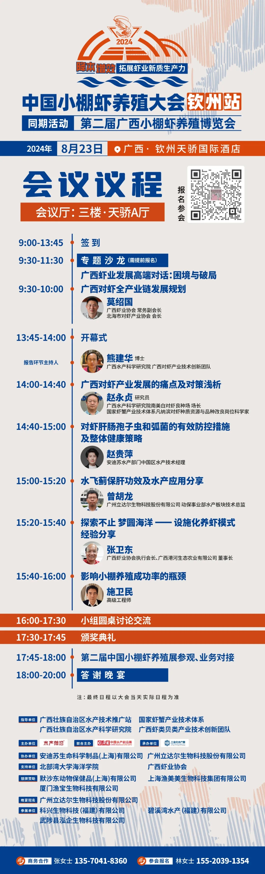 | 水產(chǎn)前沿網(wǎng)獨(dú)家報(bào)道, 2024中國(guó)小棚蝦養(yǎng)殖大會(huì)(欽州站) 暨第二屆廣西小棚蝦養(yǎng)殖博覽會(huì) 會(huì)議日程 廣西蝦業(yè)發(fā)展大探討 有您參與更精彩 ↓↓↓ 【掃碼報(bào)名參會(huì)】 參會(huì)指南 一、會(huì)議時(shí)間&地點(diǎn) 時(shí)間:2024年8月23日 地點(diǎn):廣西·欽州天驕國(guó)際酒店三樓·天驕A廳 二、天氣 穿衣指數(shù):天氣炎熱,建議穿短袖、短褲等清涼夏季服裝,當(dāng)天或有雨,建議備有雨傘。 三、簽到 四、交通 五、住宿 六、用餐 會(huì)議資訊 會(huì)議背景 小棚蝦,從江蘇復(fù)制到全國(guó)各地發(fā)展,始終是中國(guó)蝦業(yè)最熱門的話題,市場(chǎng)最尖端的“寵兒”。從蝦苗選擇到尾水處理,其中各細(xì)微環(huán)節(jié)緊緊深扣,引發(fā)無(wú)數(shù)養(yǎng)蝦人的興趣,讓投資者著迷。 自廣西第一張小棚在犀牛腳扎根,經(jīng)過三年的蓬勃發(fā)展,截至今年初,廣西的小棚數(shù)量已經(jīng)近30000張,且預(yù)計(jì)未來(lái)兩年將突破6萬(wàn)張。養(yǎng)殖戶們剛剛摸清了“反酸”邏輯,做好蝦苗、飼料攻略,卻又遇尾水處理、地下使用的種種挑戰(zhàn)。新的一年,如何妥善處理海水以規(guī)避病原傳播,一年三茬的養(yǎng)殖模式能否有效緩解租金壓力,降本增效已經(jīng)火燒眉睫… 作為業(yè)內(nèi)領(lǐng)先的媒體,水產(chǎn)前沿率先將小棚提升為養(yǎng)蝦業(yè)的核心模式。2022年,我們主辦的“第九屆中國(guó)養(yǎng)蝦高手年會(huì)如東論壇”正式更名為更具影響力的“中國(guó)小棚蝦養(yǎng)殖大會(huì)”。2023年,我們成功舉辦了2023中國(guó)小棚蝦養(yǎng)殖大會(huì)(欽州站)暨首屆中國(guó)小棚蝦養(yǎng)殖展,吸引了來(lái)自江蘇、廣西、廣東、福建等多個(gè)省份的近500名優(yōu)質(zhì)養(yǎng)殖戶齊聚一堂,共同探討華南小棚蝦的崛起之道,為小棚蝦產(chǎn)業(yè)的未來(lái)發(fā)展注入新的活力。 今年8月23日,我們?cè)俅芜x址華南小棚蝦的發(fā)源地——廣西欽州,隆重舉辦2024中國(guó)小棚蝦養(yǎng)殖大會(huì)(欽州站)暨第二屆廣西小棚蝦養(yǎng)殖博覽會(huì)。本次大會(huì)將圍繞華南小棚蝦結(jié)構(gòu)升級(jí)、種苗與飼料選擇策略、海水源頭處理與病害防控、尾水處理方案及設(shè)備升級(jí)等核心議題展開深入討論,遍邀全國(guó)小棚蝦產(chǎn)業(yè)的專家、領(lǐng)先企業(yè)、規(guī)模養(yǎng)殖者,全面呈現(xiàn)小棚養(yǎng)蝦的智慧方案,聚焦降本增效,推動(dòng)廣西小棚蝦產(chǎn)業(yè)的高質(zhì)量發(fā)展。 會(huì)議主題 降本增效拓展蝦業(yè)新質(zhì)生產(chǎn)力 組織單位 指導(dǎo)單位 廣西壯族自治區(qū)水產(chǎn)技術(shù)推廣站 國(guó)家蝦蟹產(chǎn)業(yè)技術(shù)體系 廣西壯族自治區(qū)水產(chǎn)科學(xué)研究院 廣西蝦類貝類產(chǎn)業(yè)技術(shù)創(chuàng)新團(tuán)隊(duì) 主辦單位 水產(chǎn)前沿 聯(lián)合主辦單位 中國(guó)水產(chǎn)前沿展 承辦單位 工業(yè)化水產(chǎn)圈 協(xié)辦單位 安迪蘇生命科學(xué)制品(上海)有限公司 廣州立達(dá)爾生物科技股份有限公司 支持單位 北部灣大學(xué)海洋學(xué)院 廣西蝦業(yè)協(xié)會(huì) 銀牌贊助 默沙東動(dòng)物保健品(上海)有限公司 上海漁美美生物科技集團(tuán)有限公司 廈門漁寶生物科技有限公司 參展單位 科興生物科技(福建)有限公司 碧溪灣水產(chǎn)(福建)有限公司 武陟縣泓企生物科技有限公司 晚宴冠名 廣州立達(dá)爾生物科技股份有限公司 更多贊助單位誠(chéng)邀中...... 關(guān)注焦點(diǎn) 1、華南小棚蝦發(fā)展方向與相關(guān)政策解讀 2、廣西小棚蝦海水養(yǎng)殖調(diào)水方案 3、廣西小棚蝦種苗與飼料選擇策略 4、廣西小棚蝦海水源處理與病害防控 5、廣西小棚結(jié)構(gòu)優(yōu)化與升級(jí) 6、廣西小棚蝦尾水處理方案 會(huì)議亮點(diǎn) 1、把脈華南小棚蝦產(chǎn)業(yè)趨勢(shì) 2、打造華南小棚蝦產(chǎn)業(yè)專業(yè)交流平臺(tái) 3、華南小棚蝦產(chǎn)業(yè)前沿企業(yè)榜單公布 4、評(píng)選華南小棚蝦值得信賴園區(qū)與經(jīng)營(yíng)者 參會(huì)報(bào)名 1、會(huì)議注冊(cè) 會(huì)議注冊(cè)費(fèi)用:800元/人(含聽課費(fèi)、會(huì)議用餐、會(huì)議資料,交通住宿自理) 提前報(bào)名注冊(cè)享早鳥價(jià):600元/人,現(xiàn)場(chǎng)繳費(fèi)800元/人 敲黑板:規(guī)模養(yǎng)殖者享限量免費(fèi)參會(huì)名額,數(shù)量有限、先報(bào)先得! 2、報(bào)名方式 長(zhǎng)按識(shí)別下方二維碼,添加會(huì)務(wù)組聯(lián)系報(bào)名,煩請(qǐng)備注:姓名+小棚蝦論壇 參會(huì)報(bào)名:水產(chǎn)前沿編輯林思靜 【煩請(qǐng)備注:姓名+小棚蝦欽州站】 3、會(huì)務(wù)組聯(lián)系方式 胡女士:17702088463 李女士:13725215269 4、商務(wù)合作 商務(wù)合作聯(lián)系:張女士/13570418360 【煩請(qǐng)備注:姓名+小棚蝦欽州站】 |