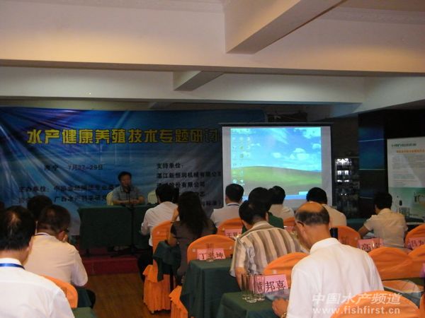 會(huì)議參與人員大概有一百人。會(huì)上,首先由廣西科研所所長(zhǎng)甘西致辭,各演講嘉賓圍繞“水產(chǎn)健康養(yǎng)殖技術(shù)”這個(gè)主題展開(kāi)演講。丁曉明以“水產(chǎn)健康養(yǎng)殖工作推進(jìn)進(jìn)展”作為演講題目,告訴大家什么是“水產(chǎn)健康養(yǎng)殖”,以及我國(guó)在關(guān)于水產(chǎn)健康養(yǎng)殖工作的進(jìn)展情況。會(huì)議參與者不時(shí)對(duì)嘉賓們的演講報(bào)以掌聲,并提出問(wèn)題。