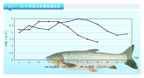 9月份,珠三角地區2-5斤規格草魚塘頭價格4.3元/斤左右;5斤以上規格在6.2元/斤以上。
