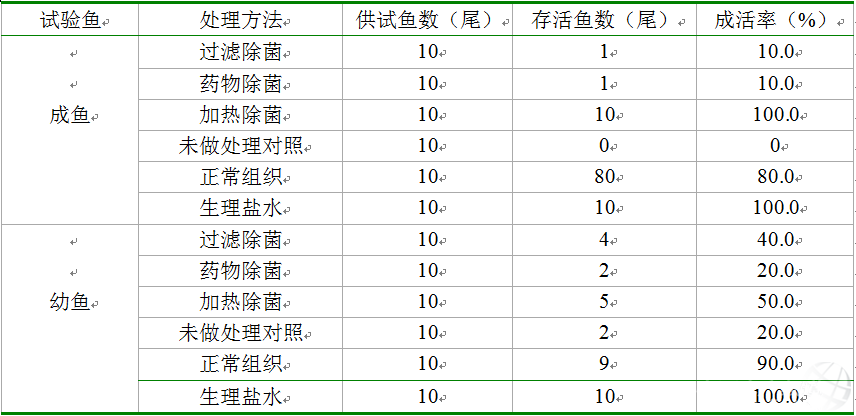 試驗魚 處理方法 供試魚數(尾) 存活魚數(尾) 成活率(%) 成魚 過濾除菌 10 2 20.0 藥物除菌 10 0 0 加熱除菌 10 8 80.0 未做處理對照 10 0 0 正常組織 10 90 90.0 生理鹽水 10 10 100.0 幼魚 過濾除菌 10 5 50.0 藥物除菌 10 3 30.0 加熱除菌 10 9 90.0 未做處理對照 10 3 30.0 正常組織 10 10 100.0 生理鹽水 10 10 100.0 在相同的飼養方式和條件下,供試銀鯽幼魚死亡率則比較低。經過接種不同方法處理的患病與正常銀鯽組織漿上清液后,接種過濾除菌試驗幼魚在14d的觀察期內,供試魚有50.0%存活,藥物處理組試驗幼魚組30.0%存活;加熱處理組試驗幼魚有90.0%存活,未做處理對照組試驗幼魚30.0%存活,注射正常組織上清液的試驗幼魚100.0%存活,而注射滅菌生理鹽水的對照幼魚也是100.0%存活。 2.2 注射人工致病銀鯽組織上清液后銀鯽發病與死亡狀況 從人工致病銀鯽中收集鰓組織和肝、脾、腎臟組織,采用不同方式處理后制備成病魚組織上清液注射不同規格銀鯽后,供試銀鯽疾病發生狀態和死亡時間狀況見表2。從表2可以看出,接種過濾除菌試驗成魚在14d的觀察期內,供試成魚有10.0%存活;藥物處理組試驗成魚組10.0%存活;加熱處理組試驗成魚有100.0%存活;未做處理對照組試驗成魚沒有魚存活;注射正常組織上清液的試驗成魚80.0%存活;而注射滅菌生理鹽水的對照成魚100.0%存活。 表2 注射各種處理的人工致病銀鯽組織漿上清液后不同規格銀鯽成活率