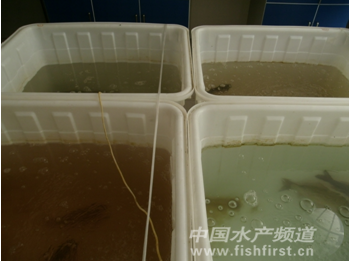 圖3 接種患病銀鯽組織漿上清液后,患病魚鰓部噴血導致水族箱中水色變紅 (左下方水族箱) 即開始大量出血,血液會順著鰓絲流出,在下頜等體表處分布點狀出血點,解剖見肝臟出血,脾臟、腎臟腫大,嚴重時魚鰾分布大量出血點。對于出現“鰓出血病”癥狀的池塘,通過采用微生態制劑等改善水質環境、二氧化氯等消毒劑進行水體消毒,同時選擇對致病菌敏感的抗生素類藥物投喂,不能有效地緩解這種疾病的蔓延速度。因此,目前對于這種疾病尚無有效控制措施。 在本研究中,我們采用對患病銀鯽組織上清液進行濾菌膜過濾除菌、添加雙抗藥物處理殺菌、加熱處理殺菌以及不做任何處理等方法制備病魚組織漿上清液樣品,與注射正常組織上清液和滅菌生理鹽水的試驗于比較,初步闡明了養殖銀鯽“鰓出血病”的病原可能是某種病毒。這是因為將患病銀鯽組織上清液進行濾菌膜過濾和添加雙抗藥物處理,均可以達到除去或者殺滅組織漿上清液中細菌而保留病毒的目的,而對健康銀鯽接種這些組織上清液后能導致試驗與出現“鰓出血”的典型癥狀。通過接種經過加熱處理和正常組織上清液的試驗魚存活率均比較高,可能預示著組織漿上清液中的銀鯽組織,對供試健康銀鯽不會導致出現疾病癥狀。而注射滅菌生理鹽水的對照魚均未出現異常狀況,說明飼養條件和注射操作對試驗魚造成的應激性刺激不至于導致供試魚發生“鰓出血病”。 我們這個研究結果雖然未能證明養殖銀鯽“鰓出血病”究竟是由什么種類的病毒引起的,但是,已經初步提示這種病的病原有可能是某種病毒,從而為這種疾病的預防和治療提示了方向。