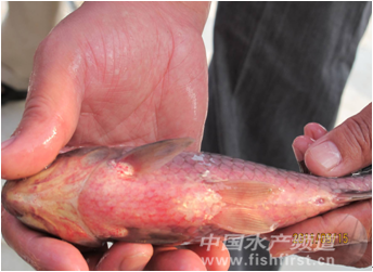 圖2 患“大紅鰓”的銀鯽 星出現,發病時間從5月初開始,瀕死魚“黑頭”較多。除感染危害銀鯽外,還可感染草魚及團頭魴。患“大紅鰓”病魚的鰓絲呈現鮮紅色,當患病魚體離水數分鐘后鰓絲即轉為暗紅色,一般有出現“花鰓”的現象,鏡檢通常發現鰓上有指環蟲,解剖發現內部器官出現不同程度的糜爛,有比較多的淡黃色透明腹水。患病池塘大多用過刺激性較強的殺蟲藥物,發生“大紅鰓”病后銀鯽的死亡量較大,但是,通過采用微生態制劑等改善水質環境、二氧化氯等消毒劑進行水體消毒,同時選擇對致病菌敏感的抗生素類藥物投喂,可以有效地緩解這種疾病的蔓延速度。 另一種癥狀主要是呈現“鰓出血”的癥狀,這種疾病自2009年開始最先在射陽周邊的養殖場出現。發病時間從4月初即開始,主要感染100.0g以上的銀鯽,表現為鰓部嚴重充血,嚴重時出現鰓部向外噴血的現象(圖3),將具有典型癥狀的瀕死魚提離水面時,鰓部
